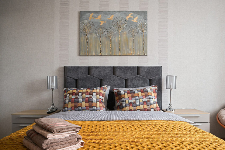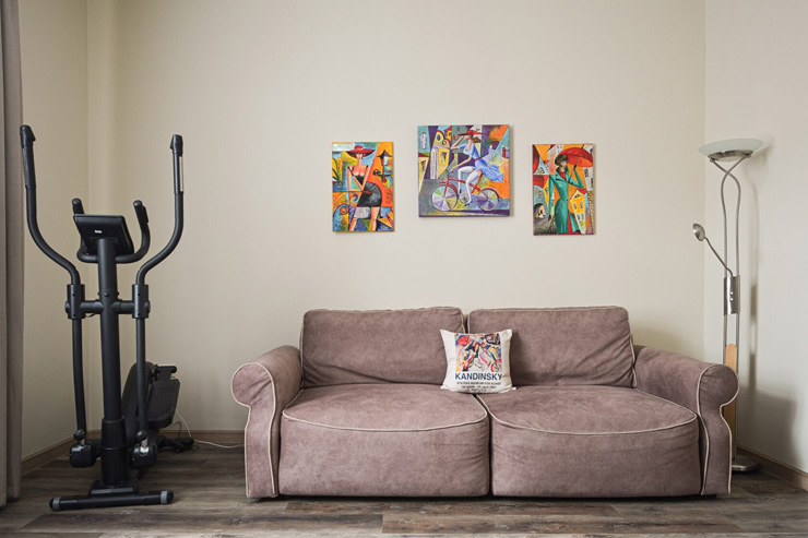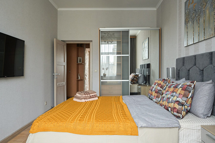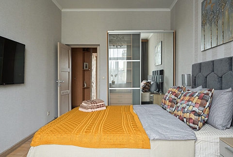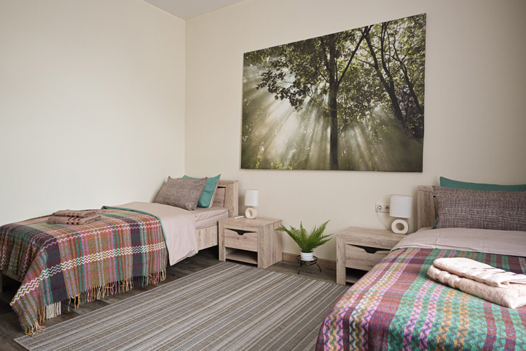 В номере: вешалка, диван, зеркало, комод, кровати односпальные, кровать двуспальная, прикроватные тумбочки, стол, стулья, шкаф, духовой шкаф, микроволновая печь, набор посуды, плита газовая, стиральная машина, телевизор, холодильник, электрочайник