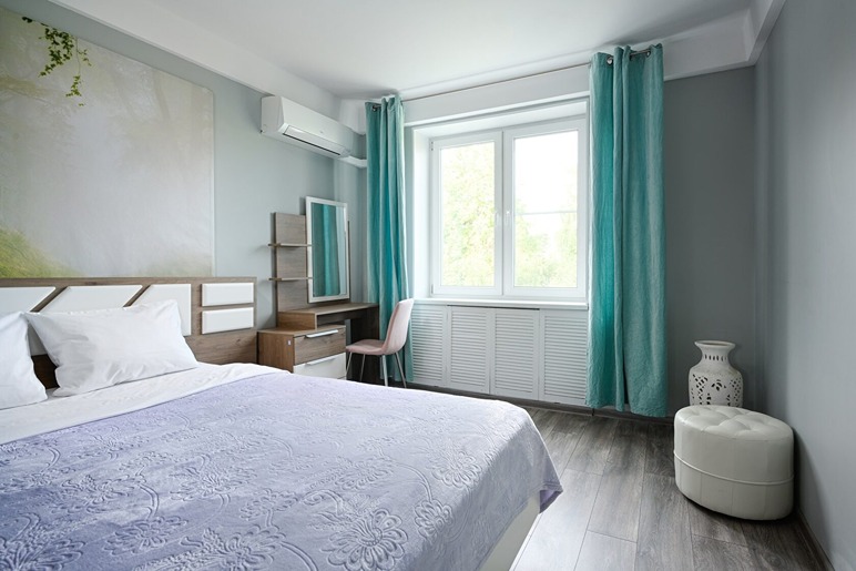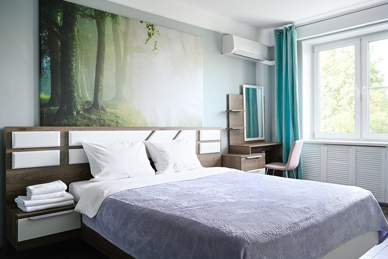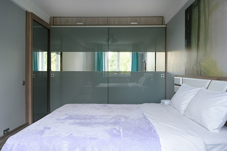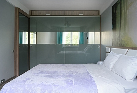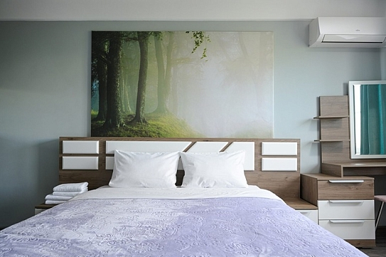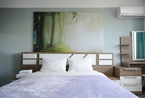 В номере: вешалка, диван раскладной, зеркало, кровать двуспальная, прикроватные тумбочки, стол, стулья, шкаф, духовой шкаф, кондиционер, микроволновая печь, набор посуды, плита газовая, посудомоечная машина, стиральная машина, телевизор, холодильник, электрочайник