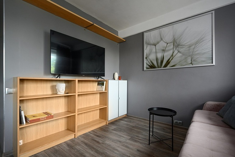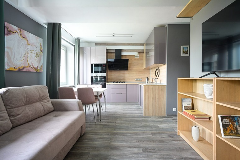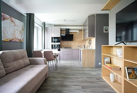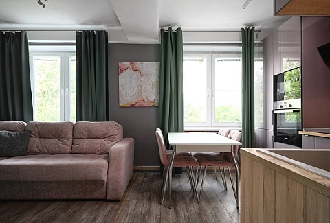 На первом этаже открыты магазины продуктов и товаров для дома, аптека.В стильных апартаментах, оформленных в сдержанной цветовой гамме, большие окна, добавляющие помещениям света. В изолированной спальне установлены двуспальная кровать и вместительный шкаф. Кухня-гостиная располагает пространством со всем необходимым для приготовления еды, посудомоечной машиной, обеденным столом, мягкими стульями, а также зоной отдыха с раскладным диваном и телевизором. Прихожая оборудована шкафом-купе с зеркалами. Совмещенный санузел укомплектован ванной и стиральной машиной. Гости могут подключиться к Wi-Fi.