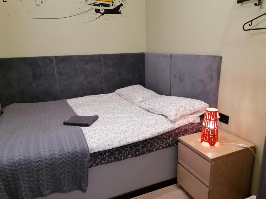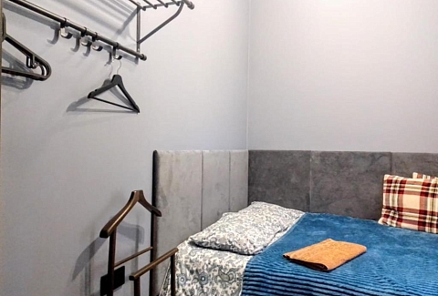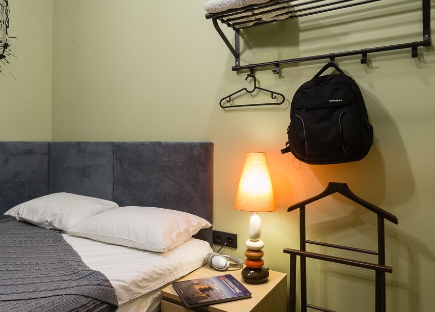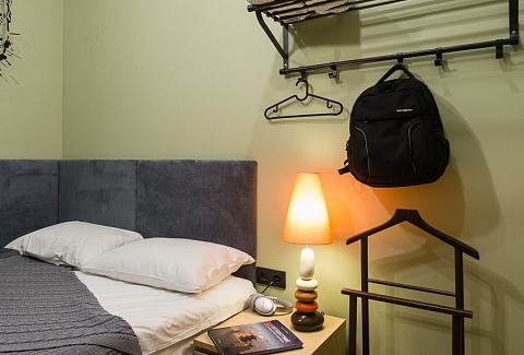 В номере: вешалка, кровать двуспальная, прикроватная тумбочка,