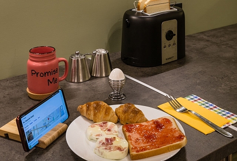 - общая кухня холодильник, микроволновая печь, плита, духовка, чайник, кухонные принадлежности, стиральная машина, сушильная машина, тостер