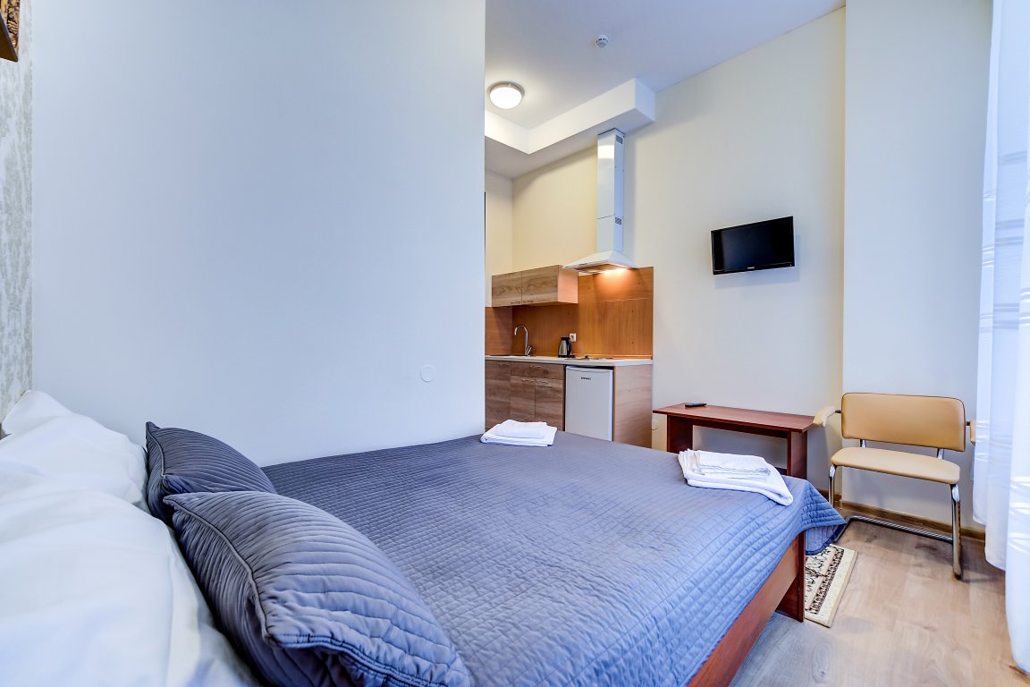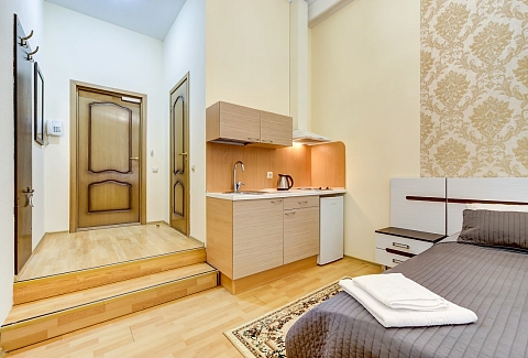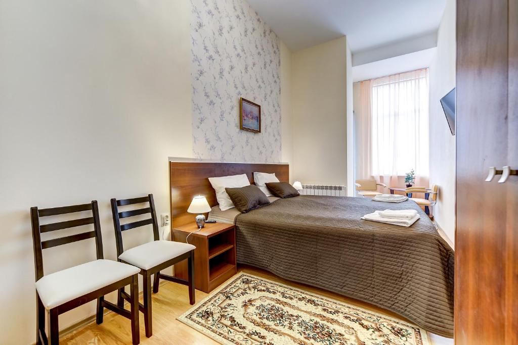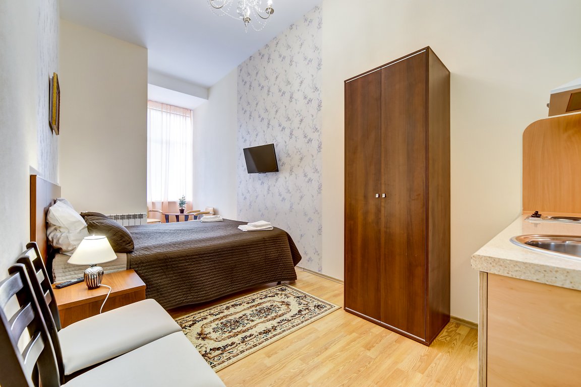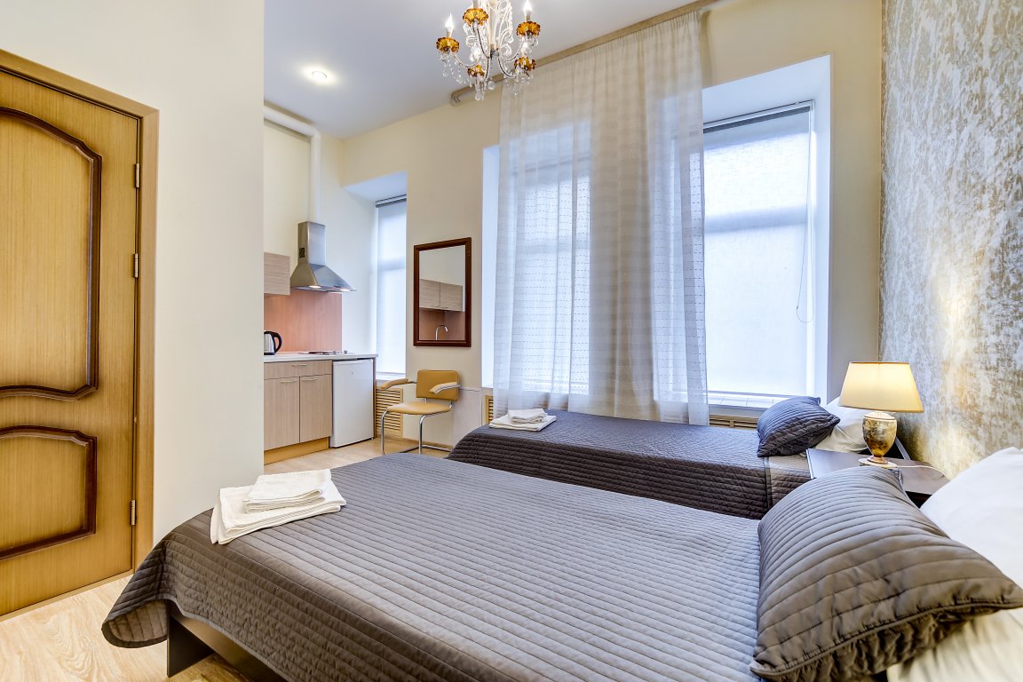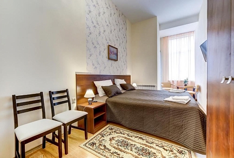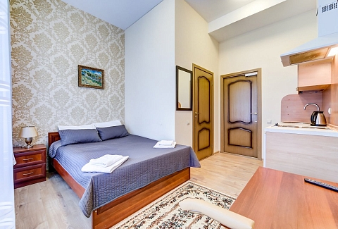 В распоряжении гостей комфортабельные номера с классическим интерьерами: есть как бюджетные варианты без окна, так и номера-студии с мини-кухней. В каждом номере предусмотрен индивидуальный санузел, есть плазменный телевизор. В числе удобств — беспроводной интернет, позволяющий всегда оставаться на связи.