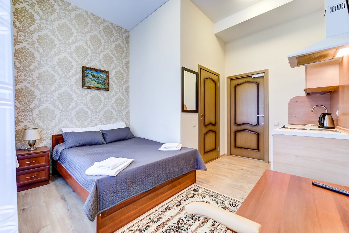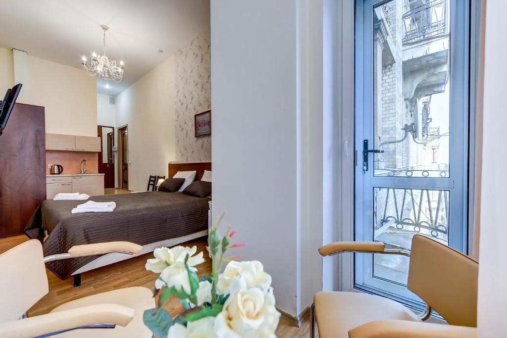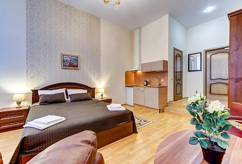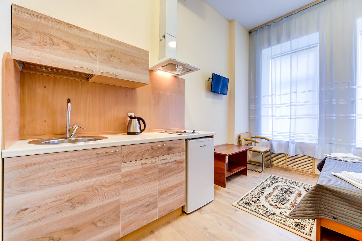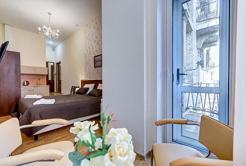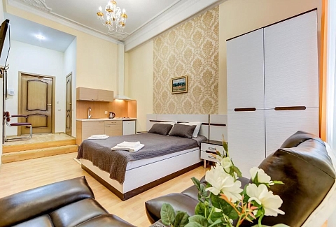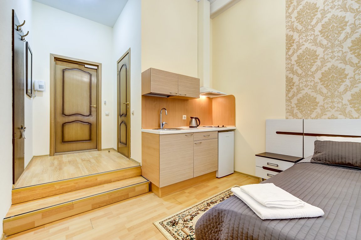 В распоряжении гостей комфортабельные номера с классическим интерьерами: есть как бюджетные варианты без окна, так и номера-студии с мини-кухней. В каждом номере предусмотрен индивидуальный санузел, есть плазменный телевизор. В числе удобств — беспроводной интернет, позволяющий всегда оставаться на связи.