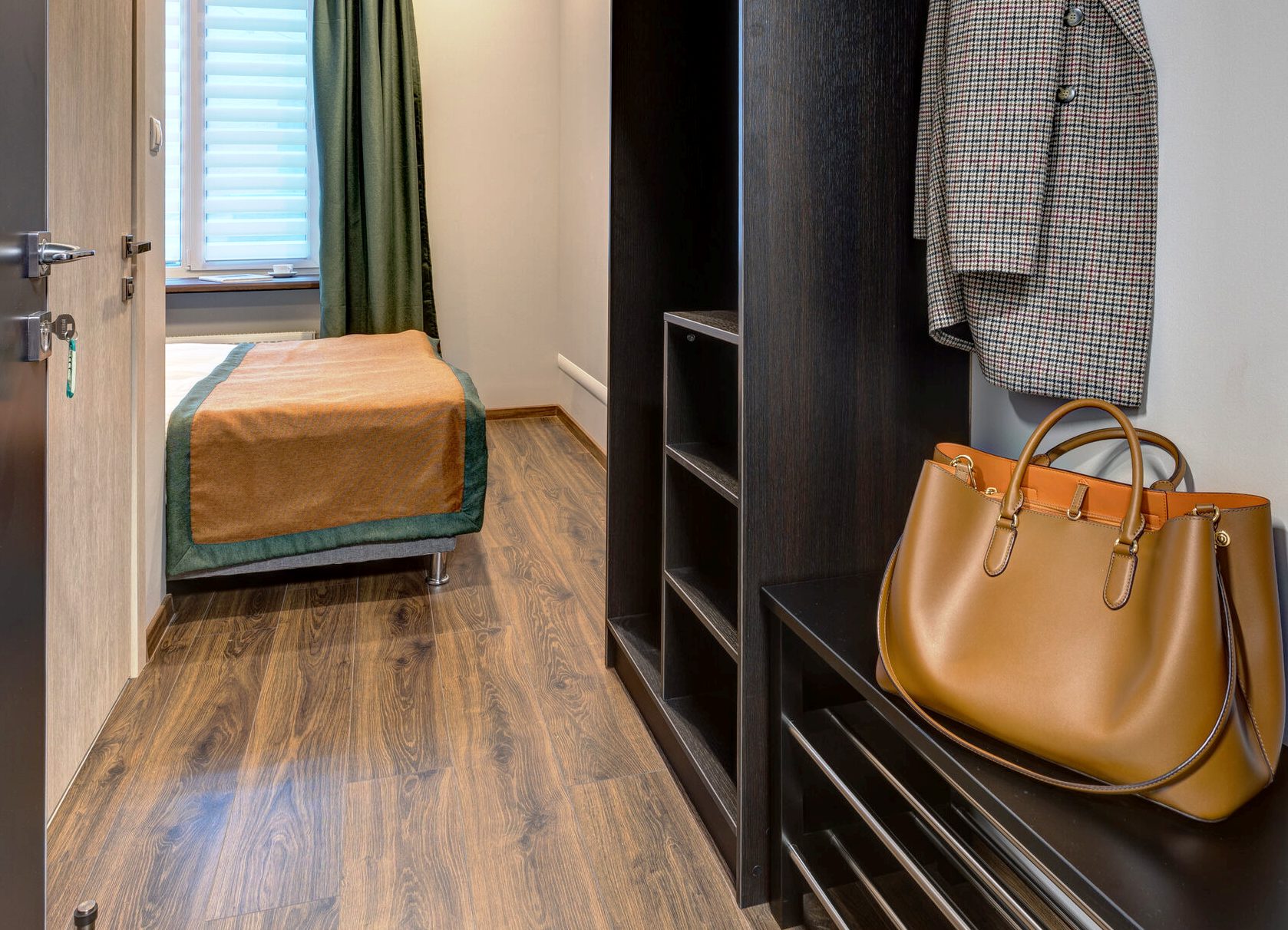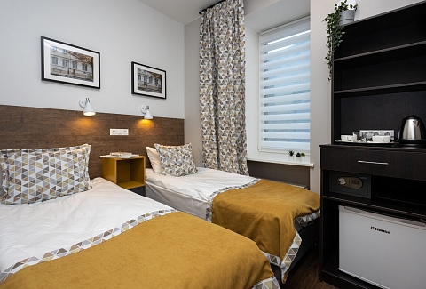В номере: вешалка, кровати односпальные /одна двуспальная кровать, прикроватная тумбочка, стул, шкаф, сейф, телевизор ЖК, холодильник, чайная станция