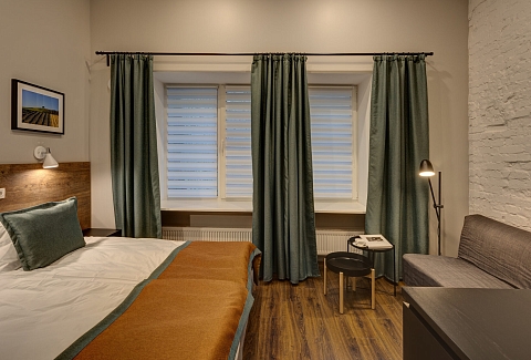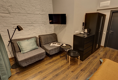 В номере: вешалка, диван раскладной, кровати односпальные /одна двуспальная кровать, прикроватная тумбочка, столик журнальный, стул, шкаф, сейф, телевизор ЖК, холодильник, чайная станция