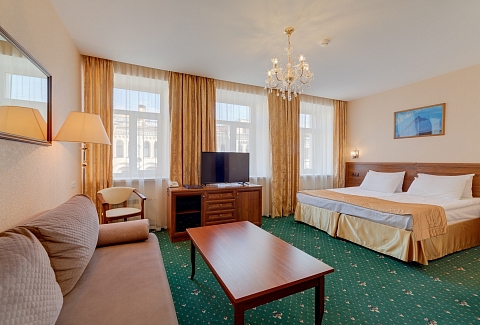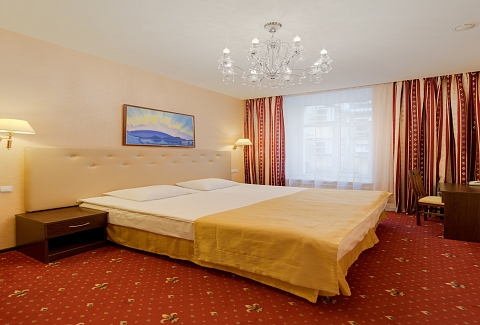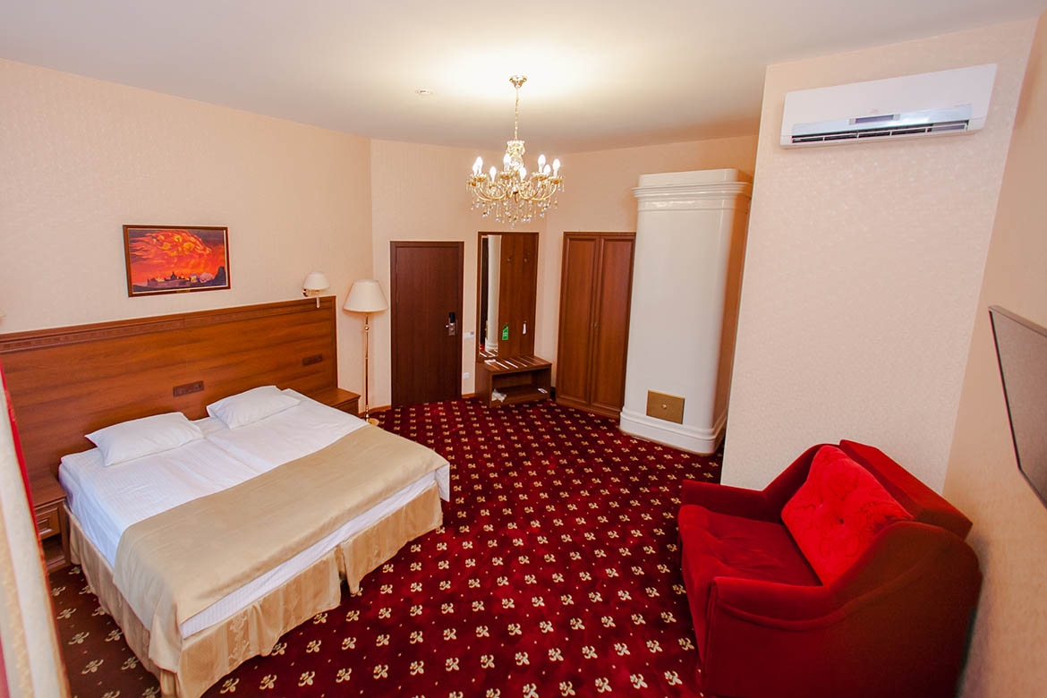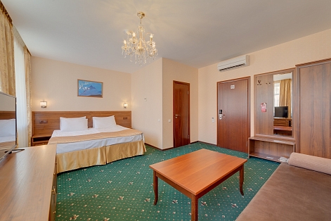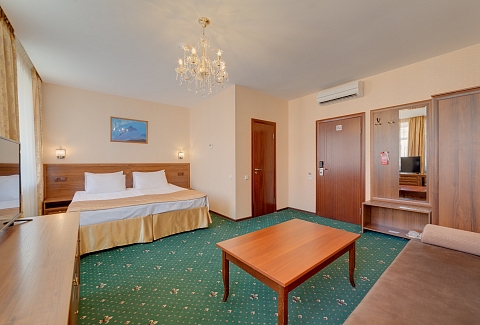 В номере: вешалка, диван, зеркало, кровать двуспальная, прикроватные тумбочки, стол, стулья, шкаф, кондиционер, мини-холодильник, сейф, телевизор, телефон