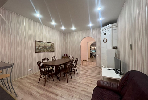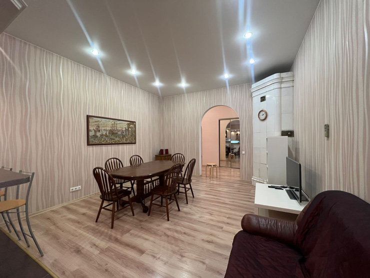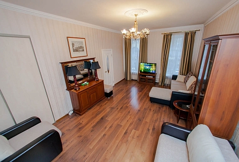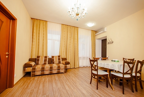 В номере: вешалка, диван, еврораскладушка, зеркало, кровати односпальные, кровать двуспальная, прикроватные тумбочки, стол, стулья, шкаф, микроволновая печь, набор посуды, плита электрическая, телевизор, холодильник, электрочайник