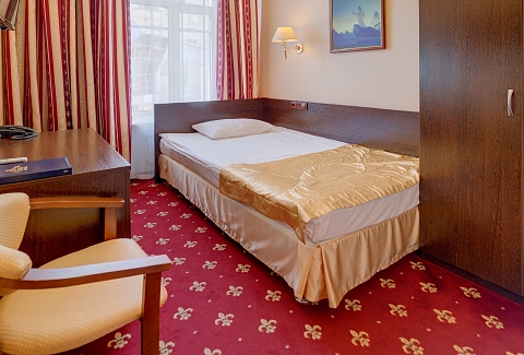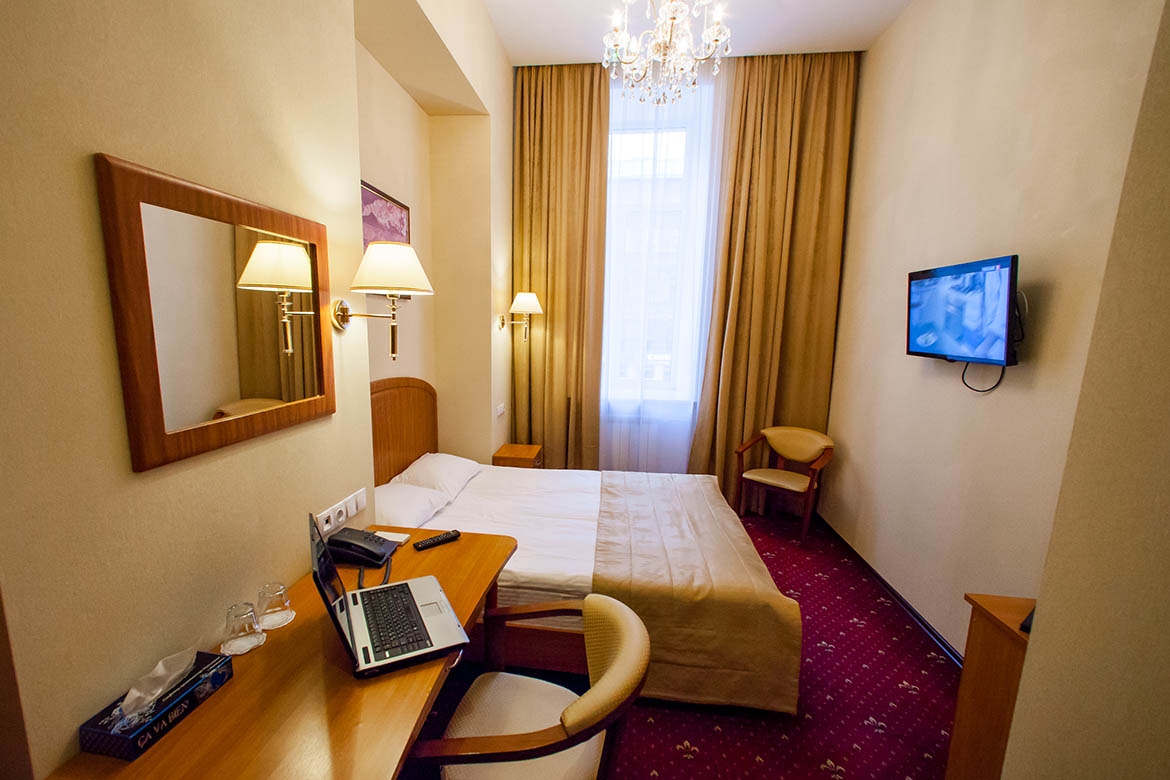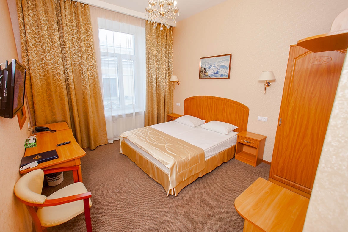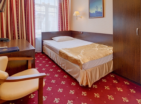 В номере: вешалка, зеркало, кровать односпальная, прикроватная тумбочка, стол, стул, шкаф, кондиционер, мини-холодильник, сейф, телевизор, телефон