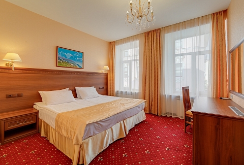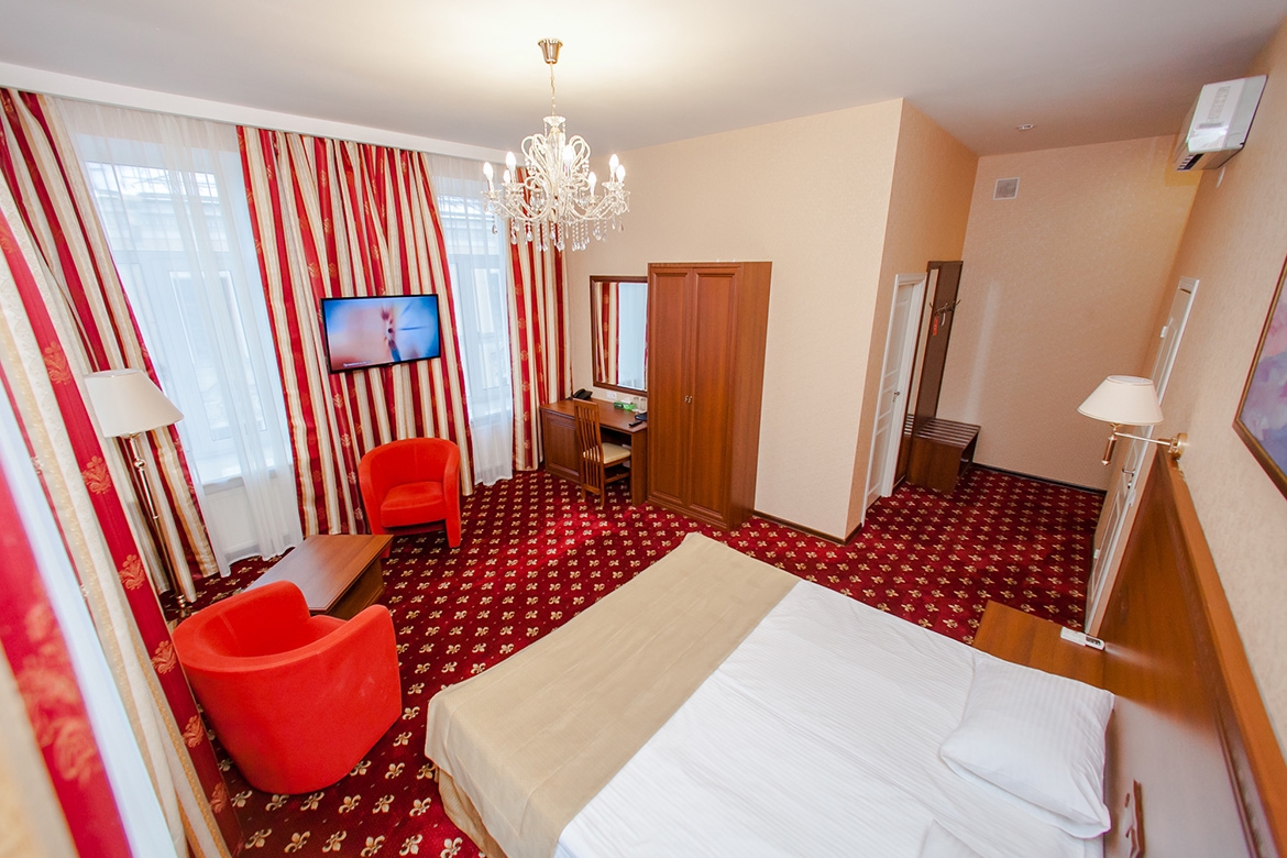 В номере: вешалка, зеркало, кровать двуспальная, прикроватные тумбочки, стол, стулья, шкаф, кондиционер, мини-холодильник, сейф, телевизор, телефон