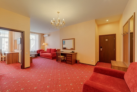 В номере: вешалка, диван, зеркало, кровать двуспальная, прикроватные тумбочки, стол, стулья, шкаф, кондиционер, микроволновая печь, набор посуды, сейф, телевизор, телефон, холодильник, электрочайник