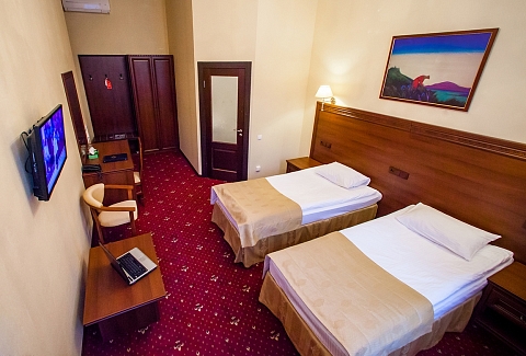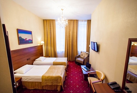 В номере: вешалка, зеркало, кровати односпальные, прикроватные тумбочки, стол, стулья, шкаф, кондиционер, мини-холодильник, сейф, телевизор, телефон