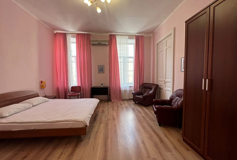 В номере: вешалка, диван раскладной, зеркало, кровать двуспальная, прикроватные тумбочки, стол, стулья, шкаф, кондиционер, микроволновая печь, набор посуды, сейф, телевизор, телефон, электрочайник