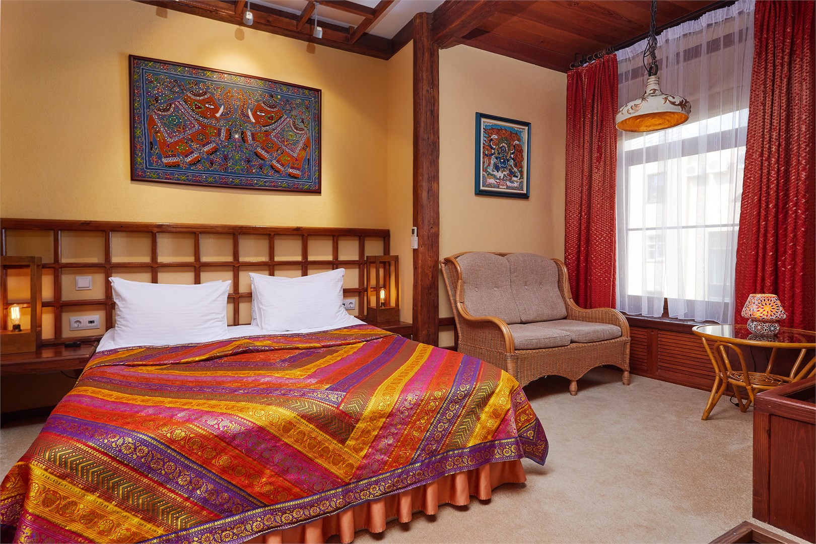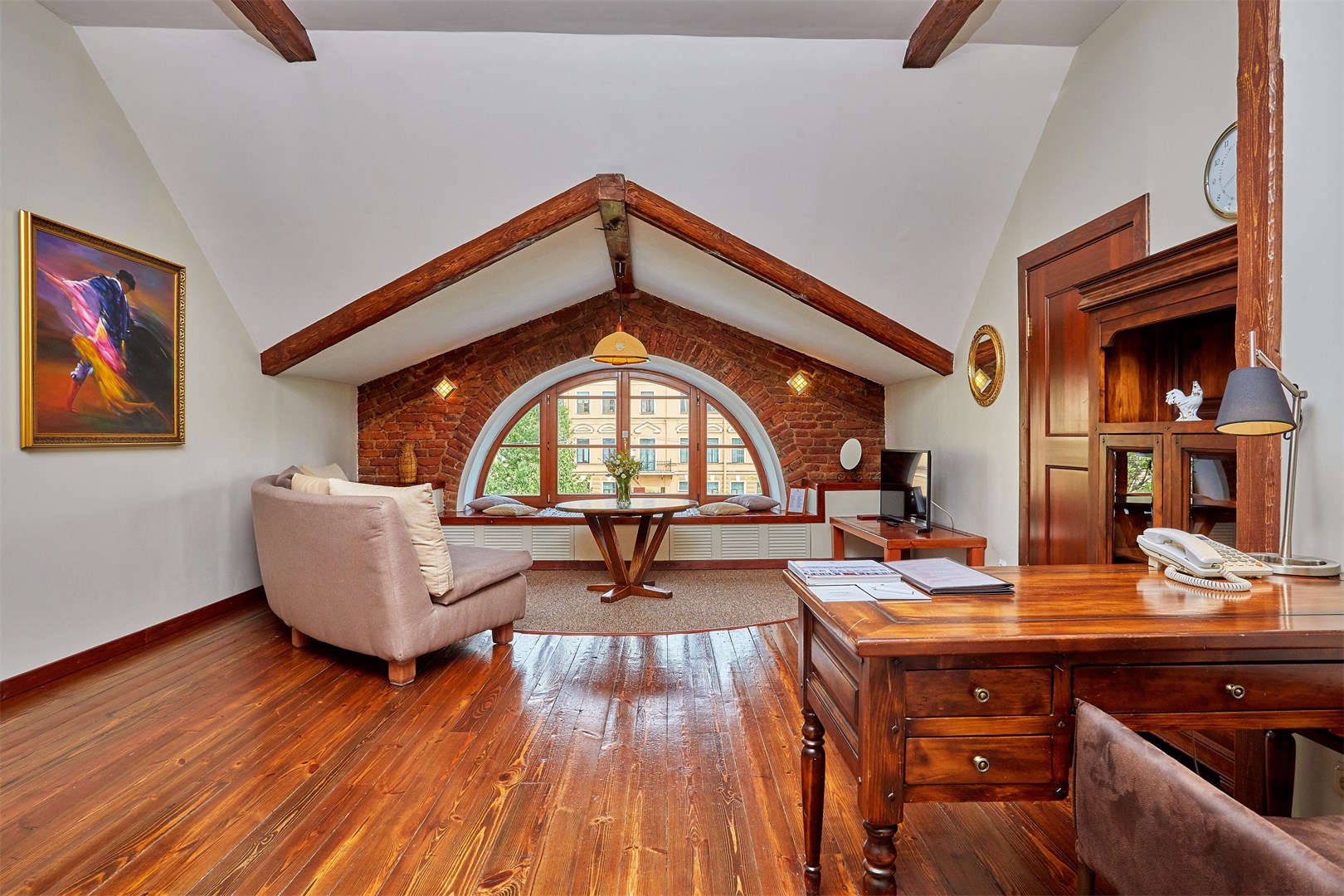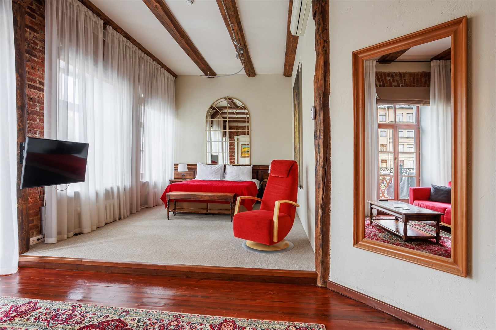 В номере: вешалка, диван, зеркало, кресло, кровать двуспальная, прикроватные тумбочки, стол, столик журнальный, стул, тумба багажная, шкаф, кондиционер, сейф, телевизор ЖК, телефон