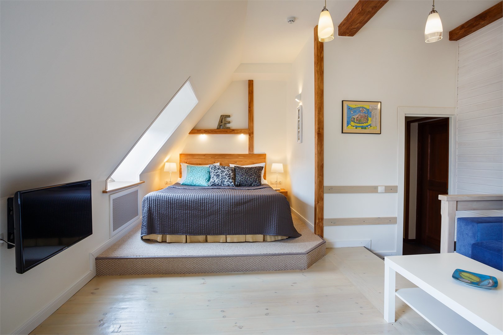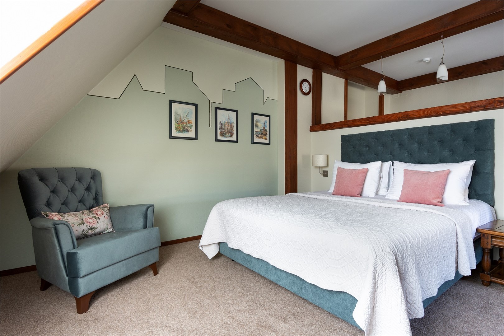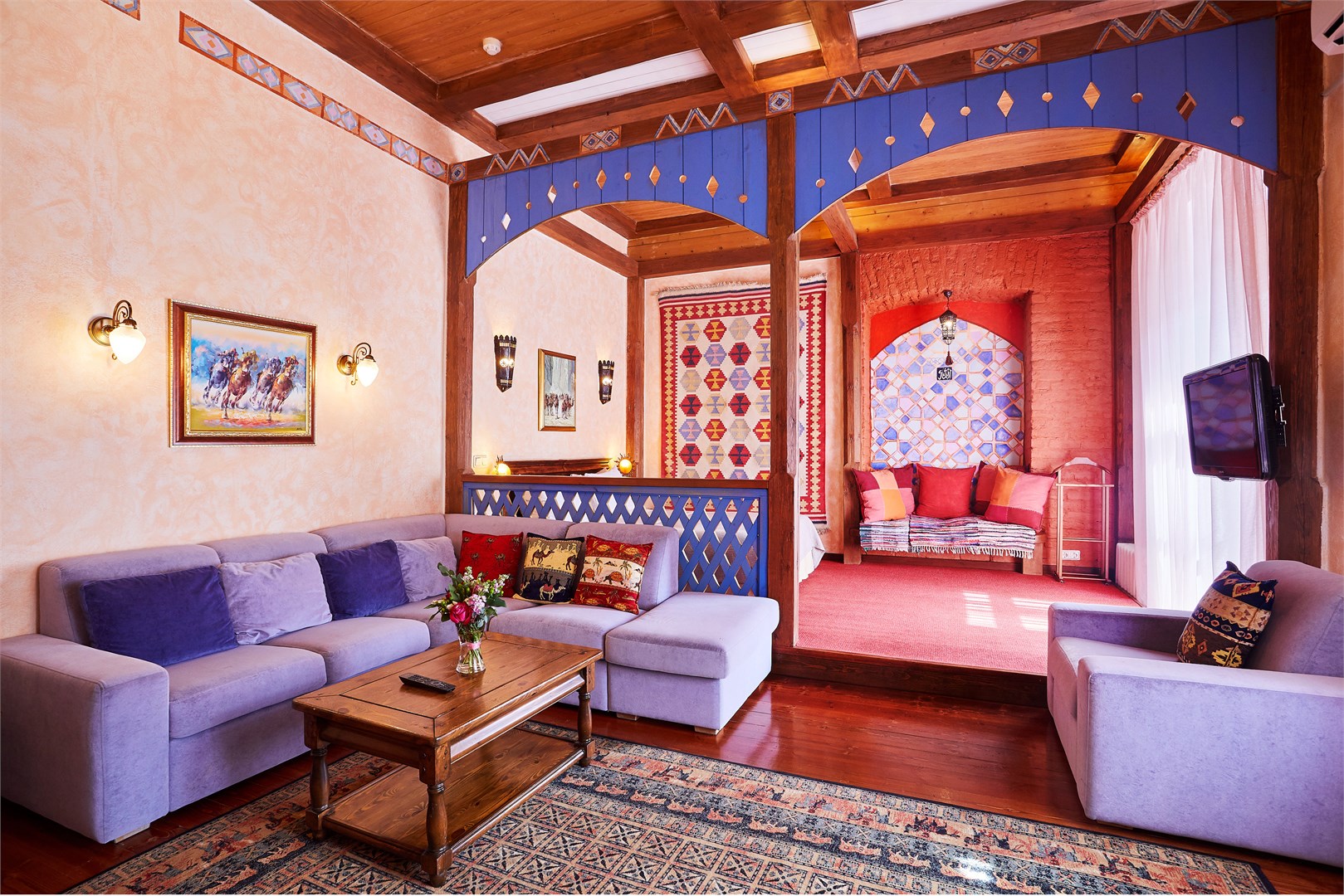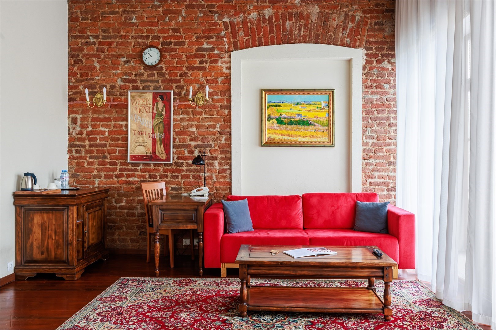 В номере: вешалка, диван, зеркало, кресло, кровать двуспальная, прикроватные тумбочки, стол, столик журнальный, стул, тумба багажная, шкаф, кондиционер, сейф, телевизор ЖК, телефон