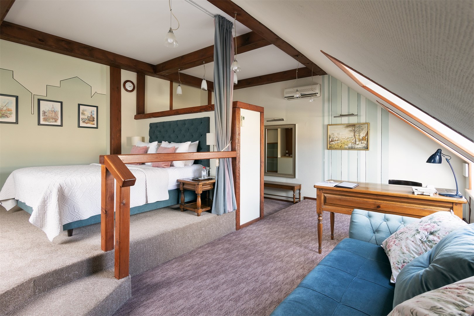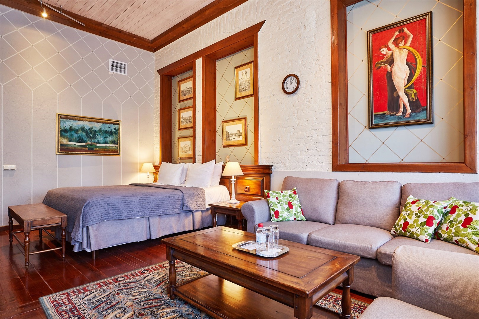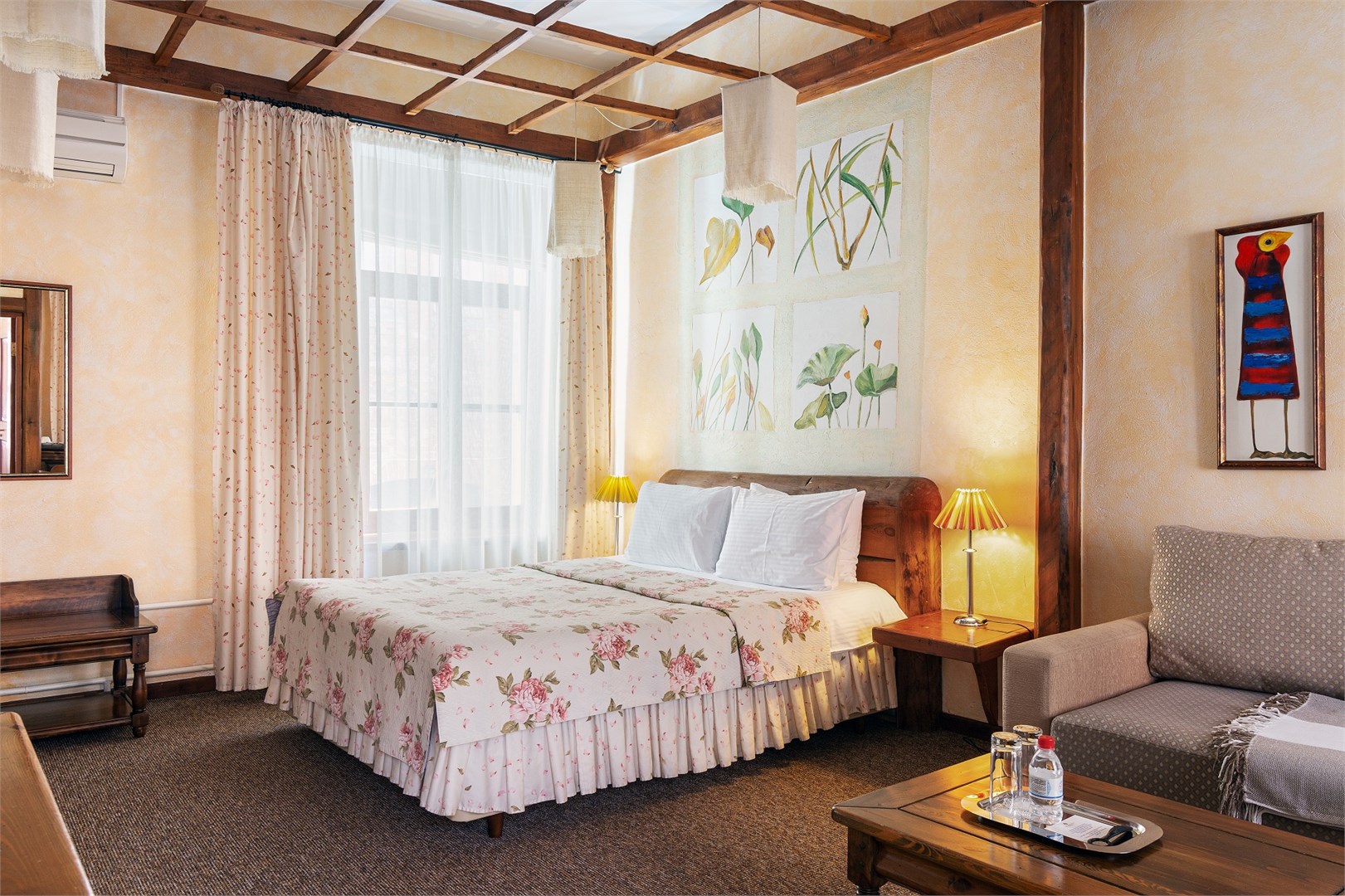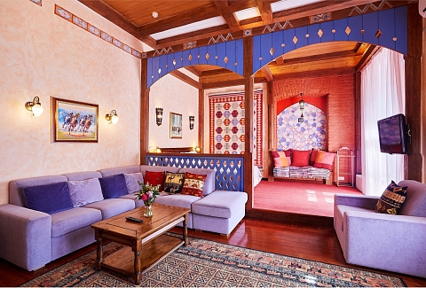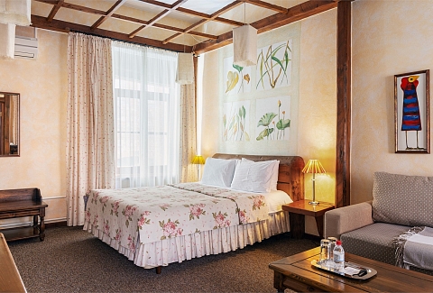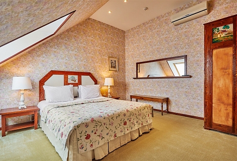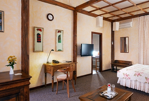 В номере: вешалка, диван, зеркало, кресла, кровать двуспальная, прикроватные тумбочки, стол, столик журнальный, стулья, шкаф, кондиционер, сейф, телевизор, телефон