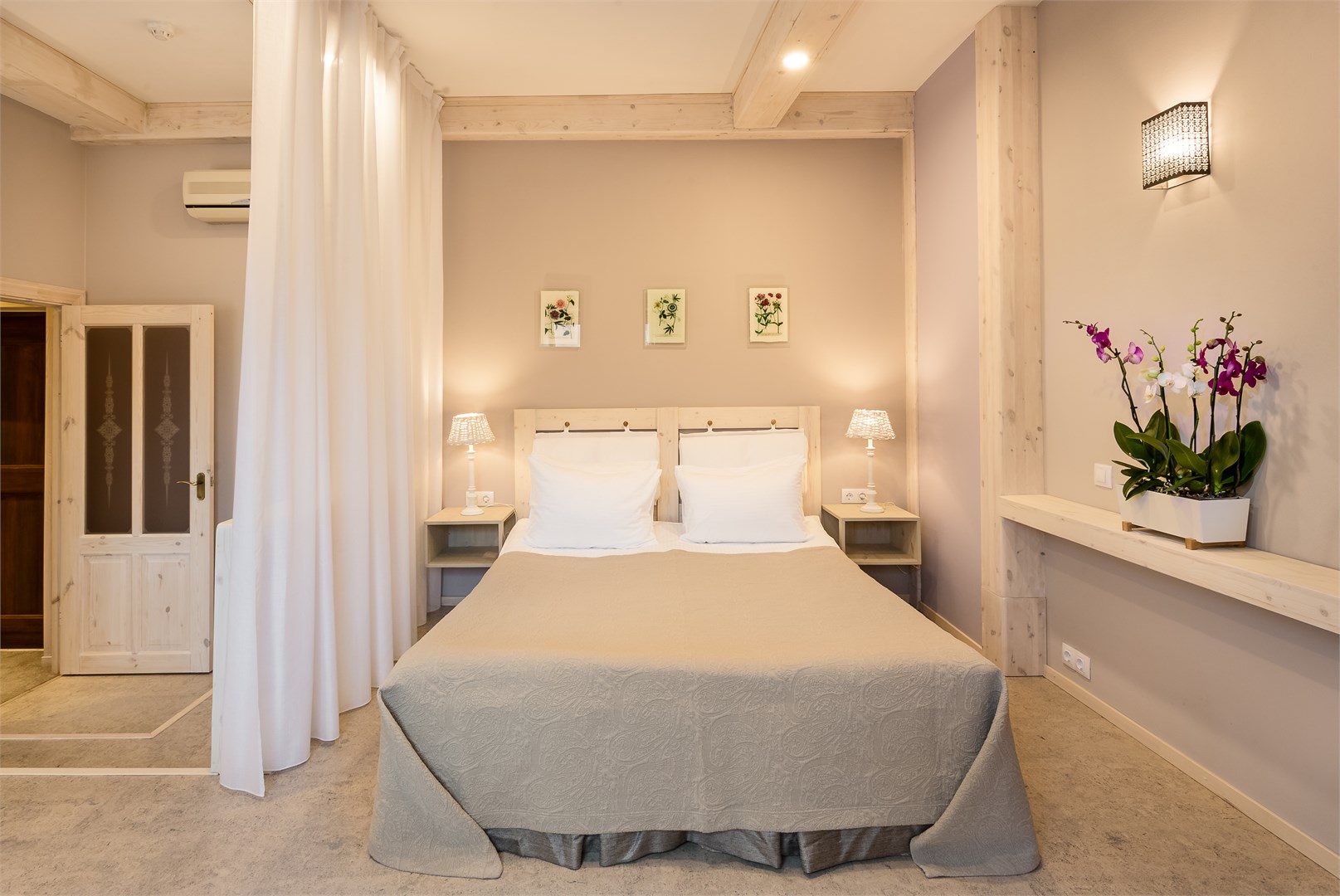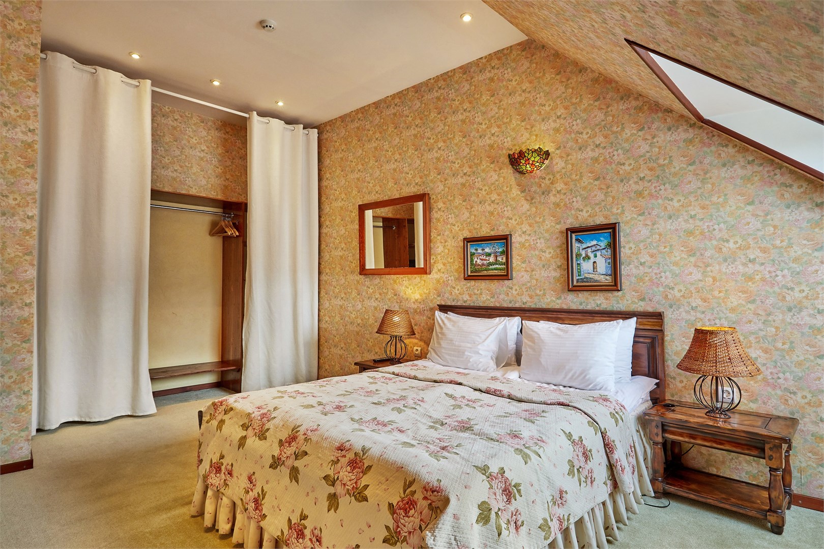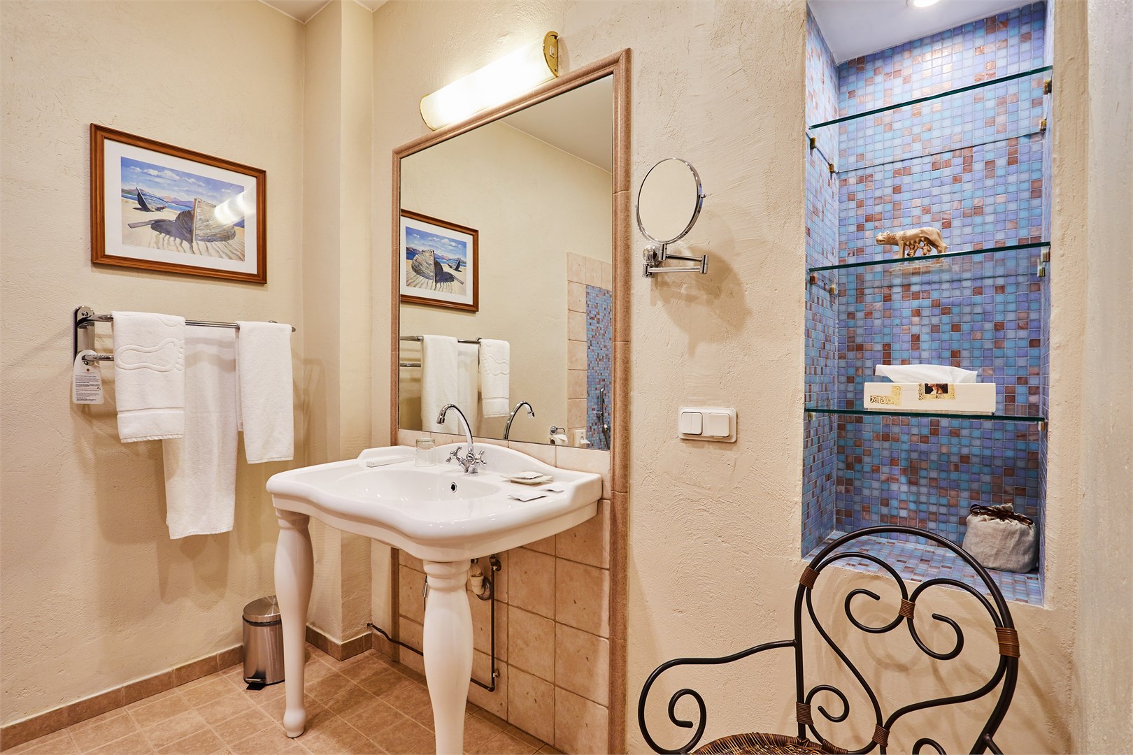 В номере: вешалка, диван, зеркало, кресла, кровать двуспальная, прикроватные тумбочки, стол, столик журнальный, стулья, шкаф, кондиционер, сейф, телевизор, телефон