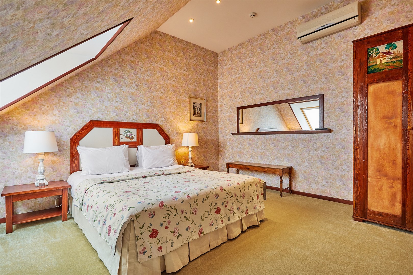 В номере: вешалка, зеркало, кровать двуспальная, прикроватная тумбочка, стол, стул, кондиционер, сейф, телевизор ЖК, телефон
