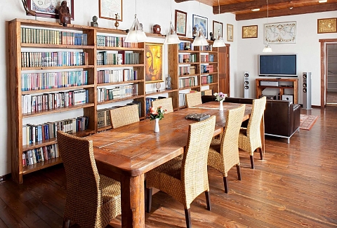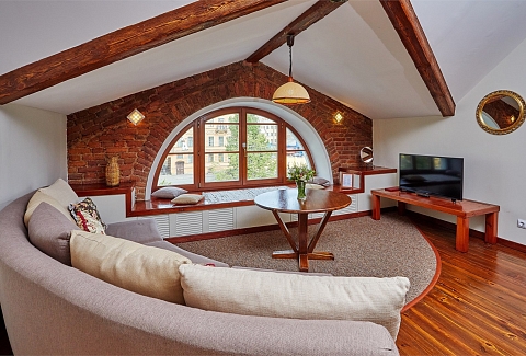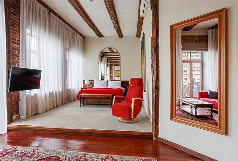 В номере: вешалка, диван, зеркало, кресла, кровать двуспальная, кухонная мебель, прикроватные тумбочки, стол, столик журнальный, стулья, тумба багажная, шкаф, кондиционер, набор посуды, плита электрическая, сейф, телевизор ЖК, телефон, холодильник, чайный набор посуды, электрочайник