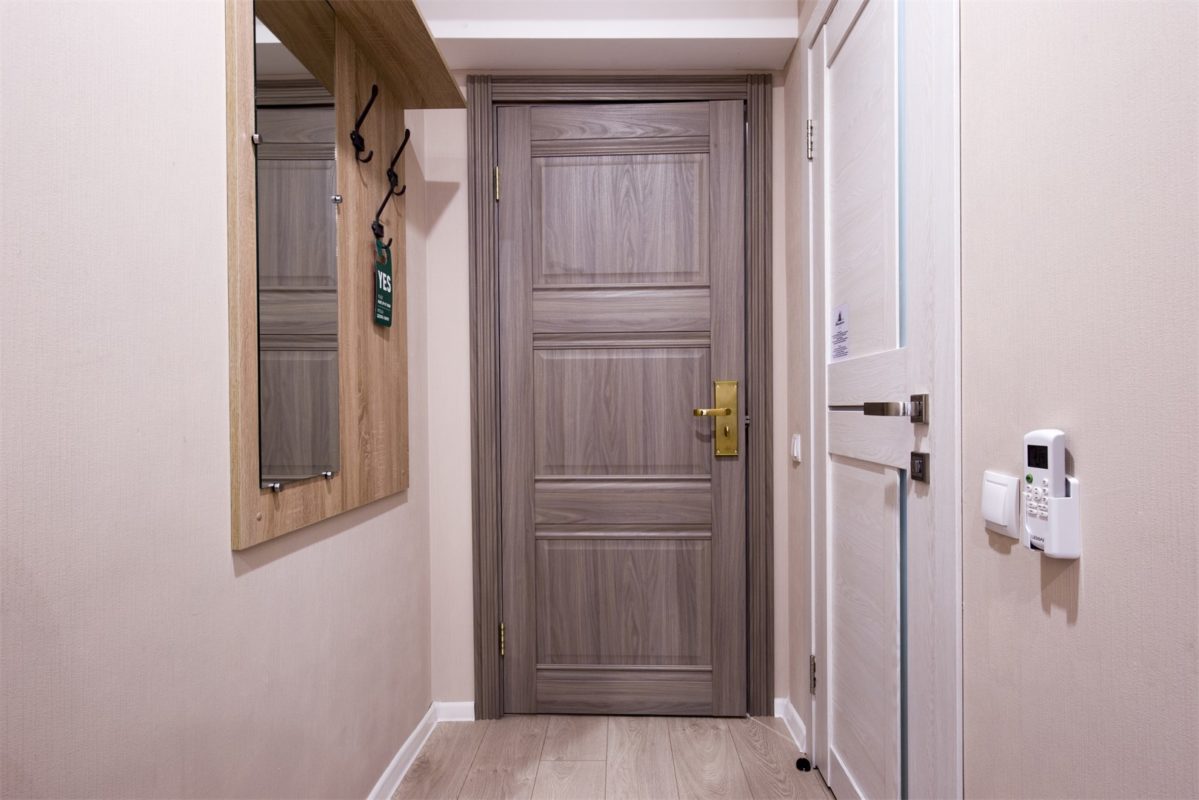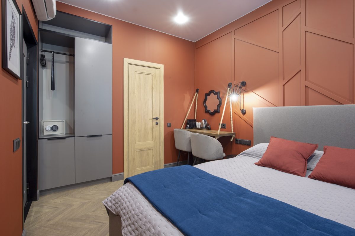 В номере: вешалка, зеркало, кровать двуспальная, прикроватные тумбочки, стол, стул, тумба, шкаф, кондиционер, сейф, телевизор, электрочайник