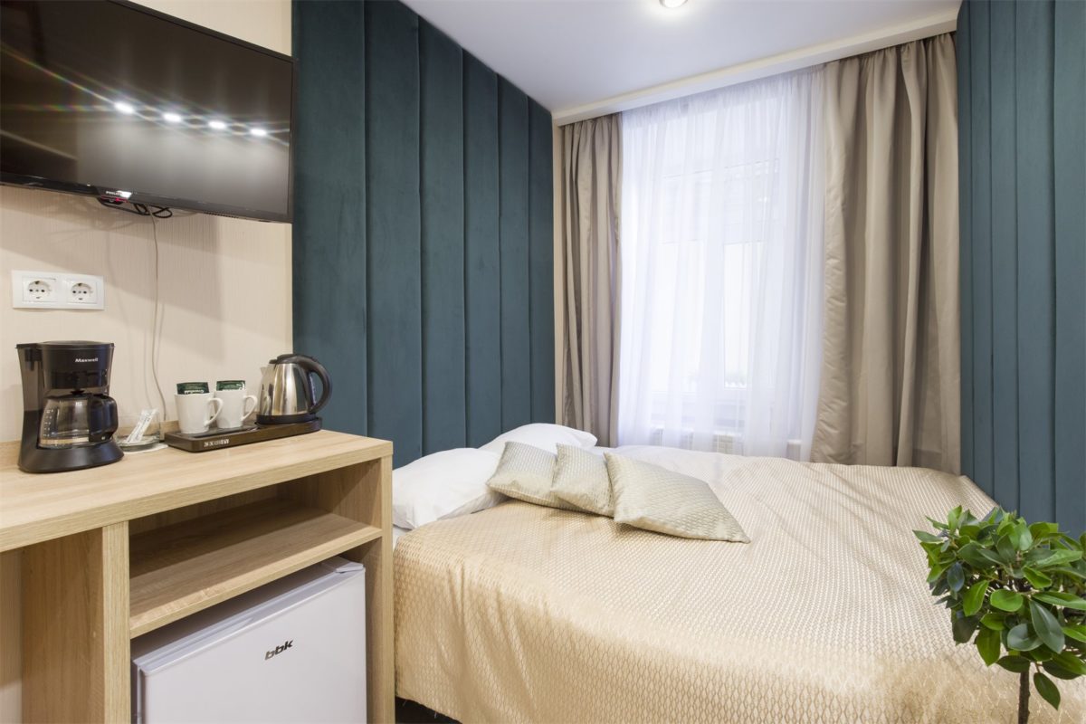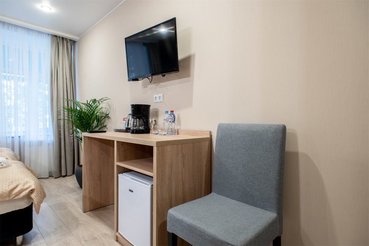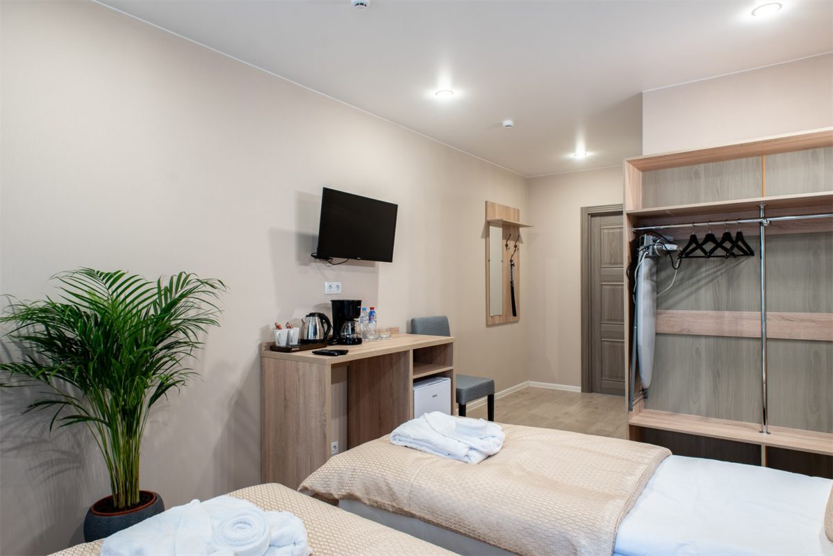 В номере: вешалка, зеркало, кресла, кровати односпальные, прикроватная тумбочка, стол, стул, шкаф, кондиционер, мини-холодильник, сейф, телевизор, электрочайник