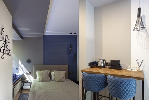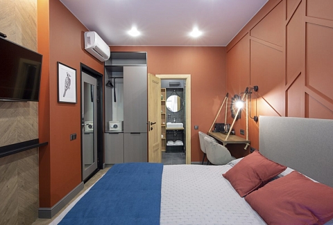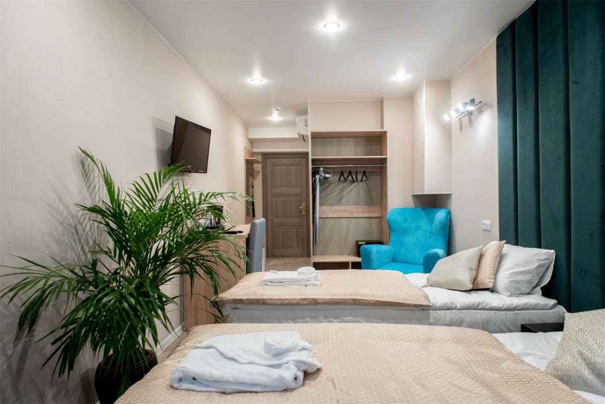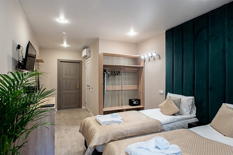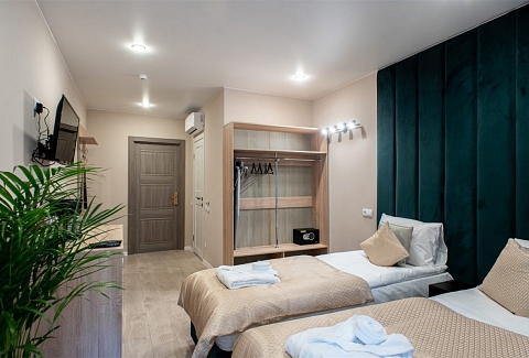 В номере: вешалка, зеркало, кровати односпальные /одна двуспальная кровать, прикроватные тумбочки, стол, стул, шкаф, кондиционер, мини-холодильник, сейф, телевизор, электрочайник