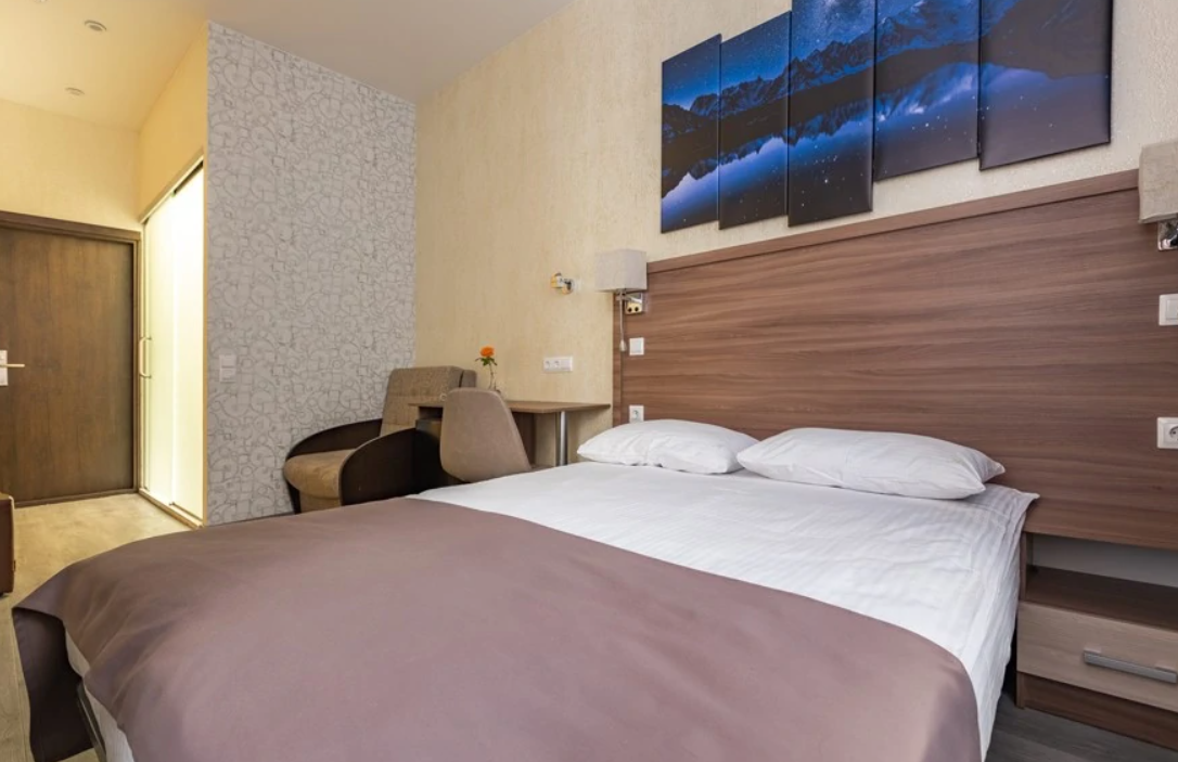 В номере: вешалка, зеркало, кресло-кровать, кровать двуспальная, прикроватные тумбочки, стол, стул, шкаф, кондиционер, мини-холодильник, сейф, телевизор, телефон