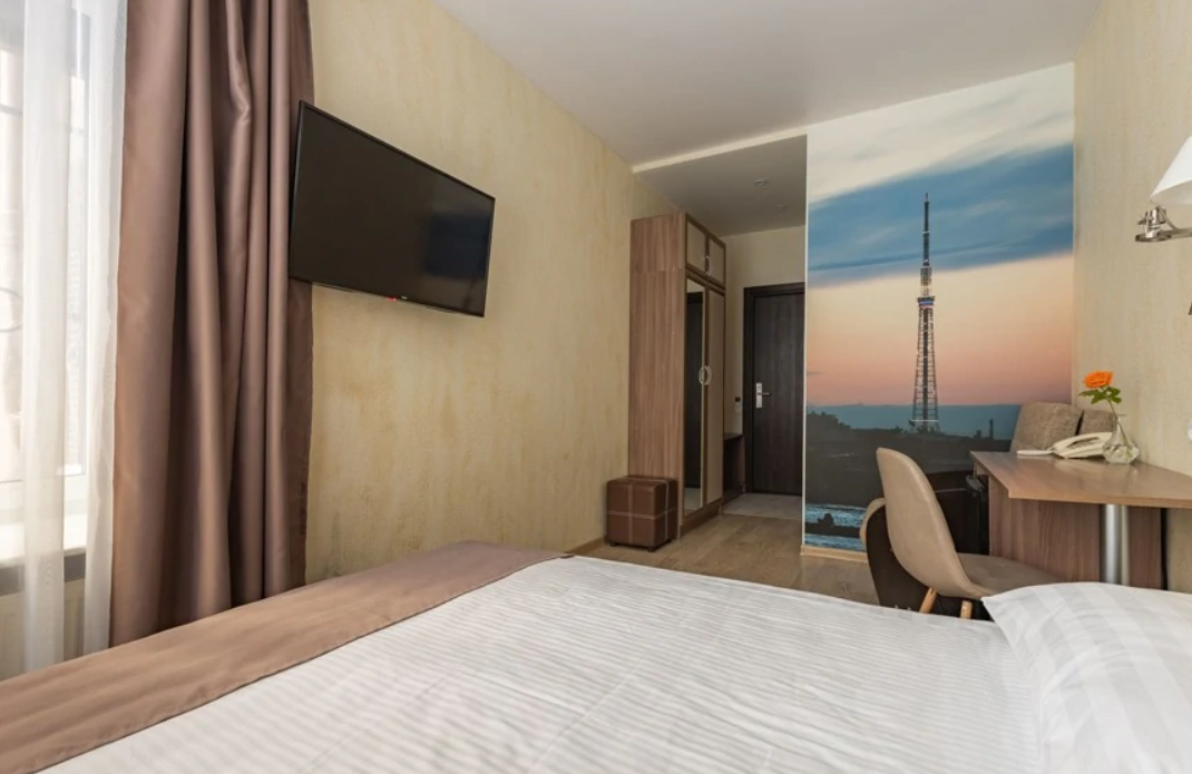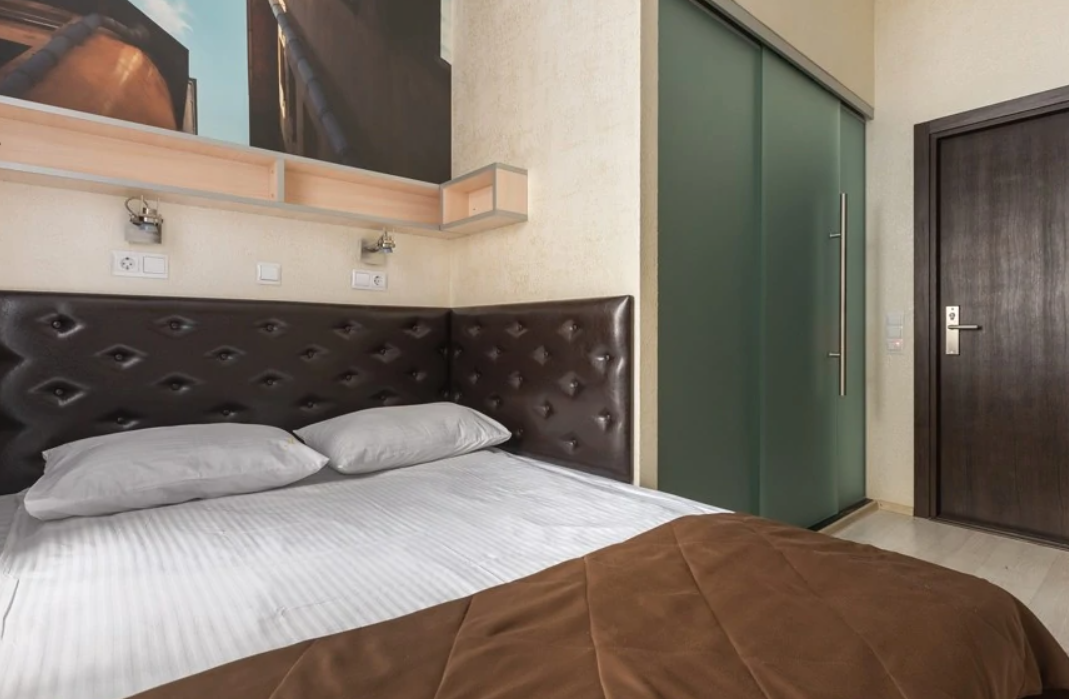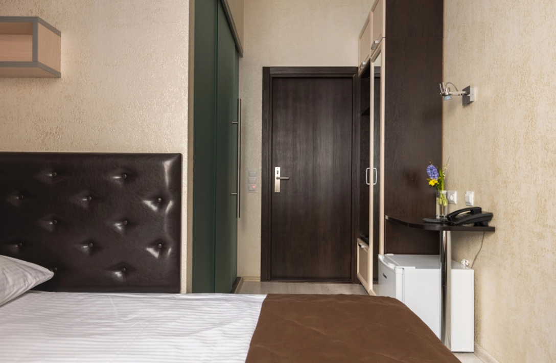 В номере: вешалка, зеркало, кровать двуспальная, прикроватные тумбочки, тумба, шкаф, мини-холодильник, сейф, телевизор, телефон