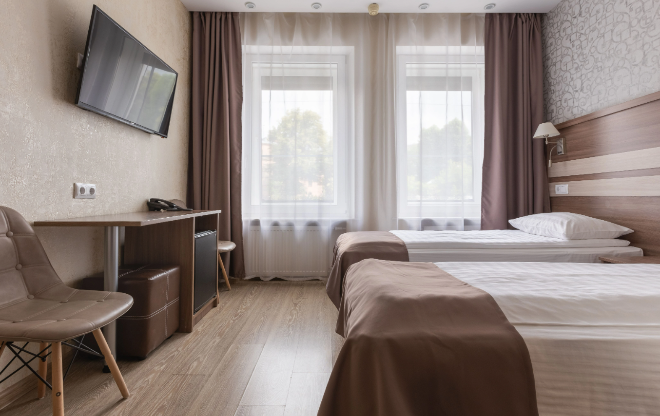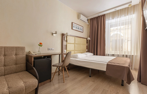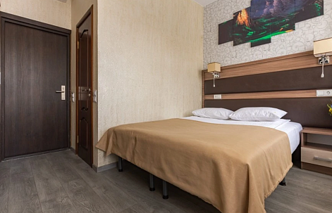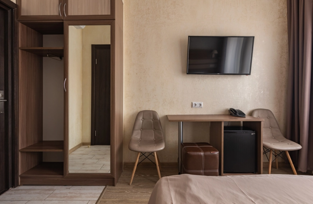 В номере: вешалка, зеркало, кровати односпальные /одна двуспальная кровать, прикроватные тумбочки, стол, стул, шкаф, кондиционер, мини-холодильник, сейф, телевизор, телефон