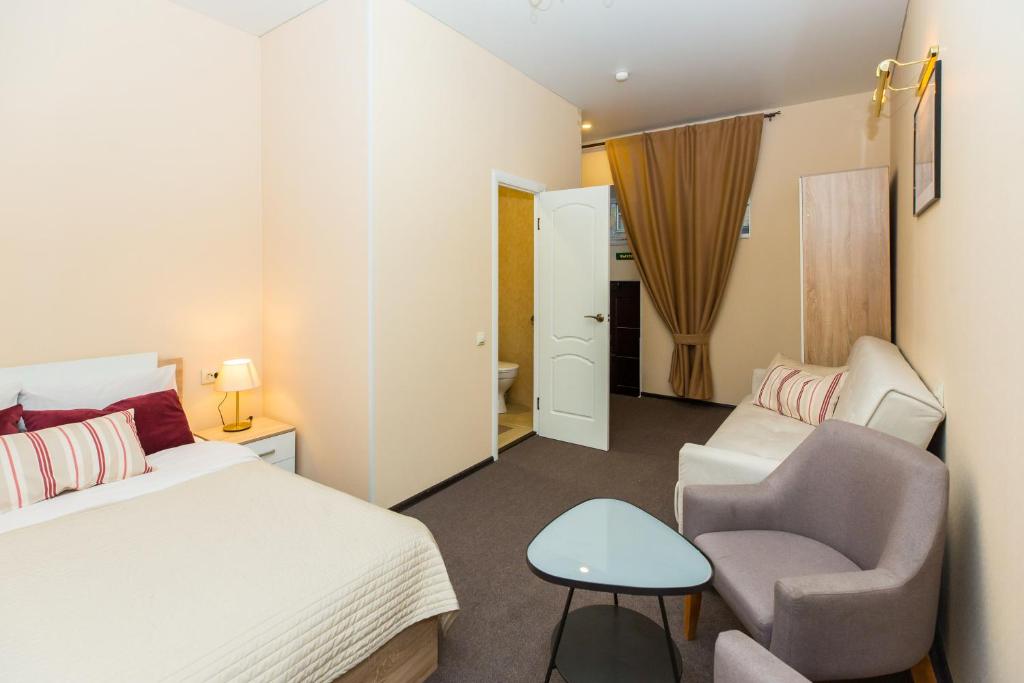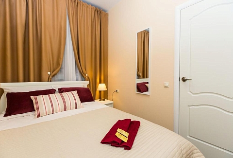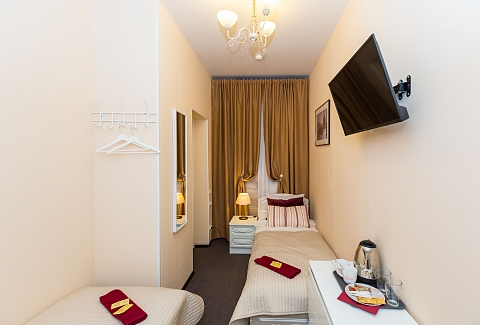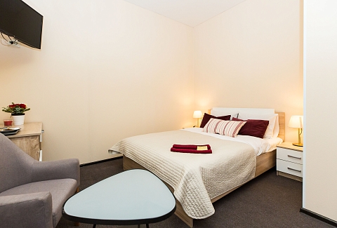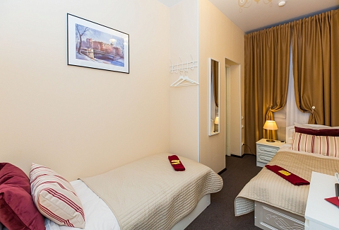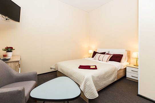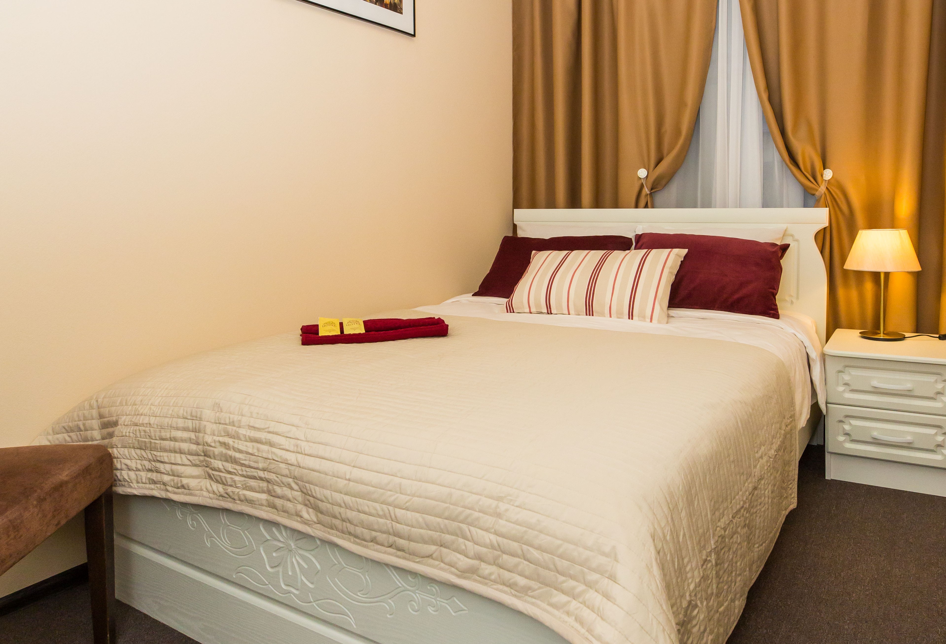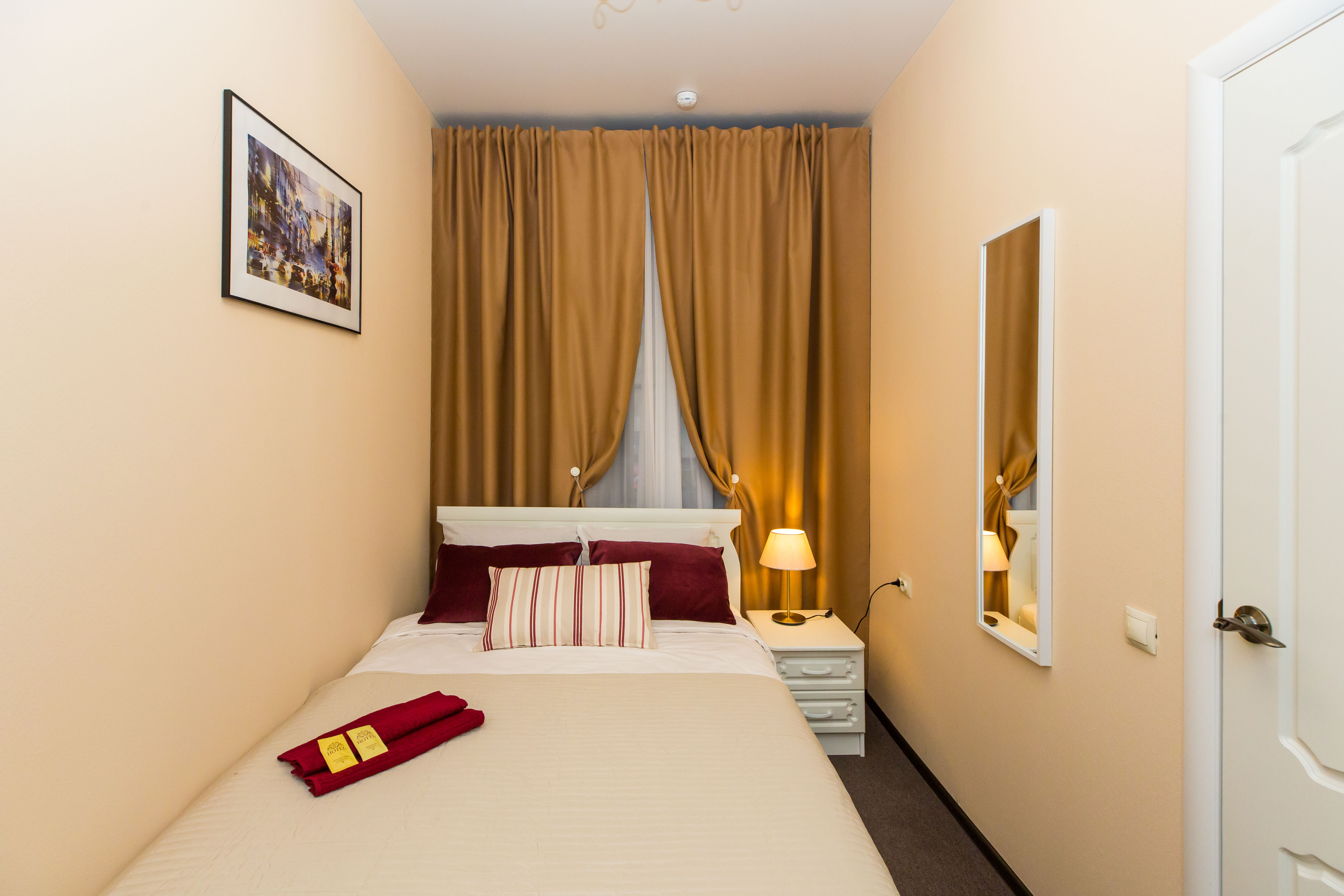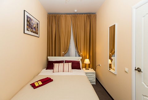 Администрация в отеле присутствует не постоянно, попасть в отель можно с помощью кодового замка, что без проблем позволяет заселиться даже в позднее время. Гостей ожидают небольшие двухместные номера, выдержанные в классической пастельной гамме с использованием благородных бордовых оттенков. В каждом номере имеется индивидуальный санузел с душем, фен, плазменный телевизор и электрочайник. В холле отеля установлены кулер с водой и микроволновая печь.Всем гостям доступен беспроводной интернет, автовладельцы при наличии свободных мест могут оставить машину на парковке во внутреннем дворике.