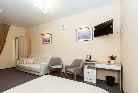 В номере: диван раскладной, зеркало, кровать двуспальная, прикроватные тумбочки, стол, столик журнальный, стулья, шкаф, микроволновая печь, мини-холодильник, телевизор, чайная станция
