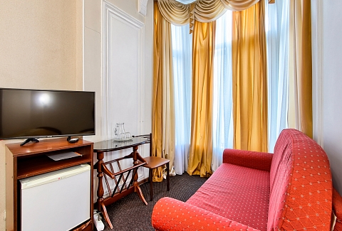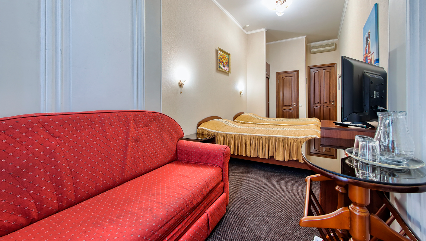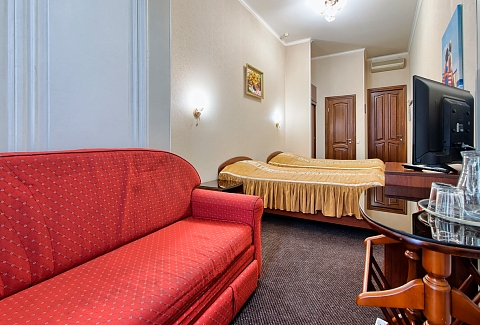 В номере: вешалка, зеркало, кресло-кровать, кровати односпальные /одна двуспальная кровать, прикроватные тумбочки, столик журнальный, стул, тумба под телевизор, шкаф, кондиционер, мини-холодильник, телевизор ЖК, телефон