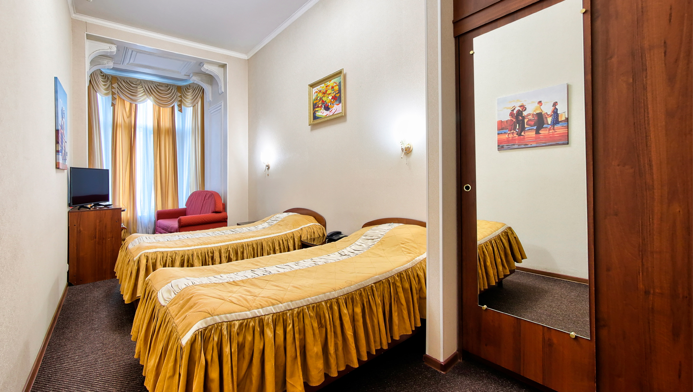 В номере: вешалка, зеркало, кровати односпальные /одна двуспальная кровать, прикроватные тумбочки, столик журнальный, стул, тумба под телевизор, шкаф, кондиционер, мини-холодильник, телевизор ЖК, телефон