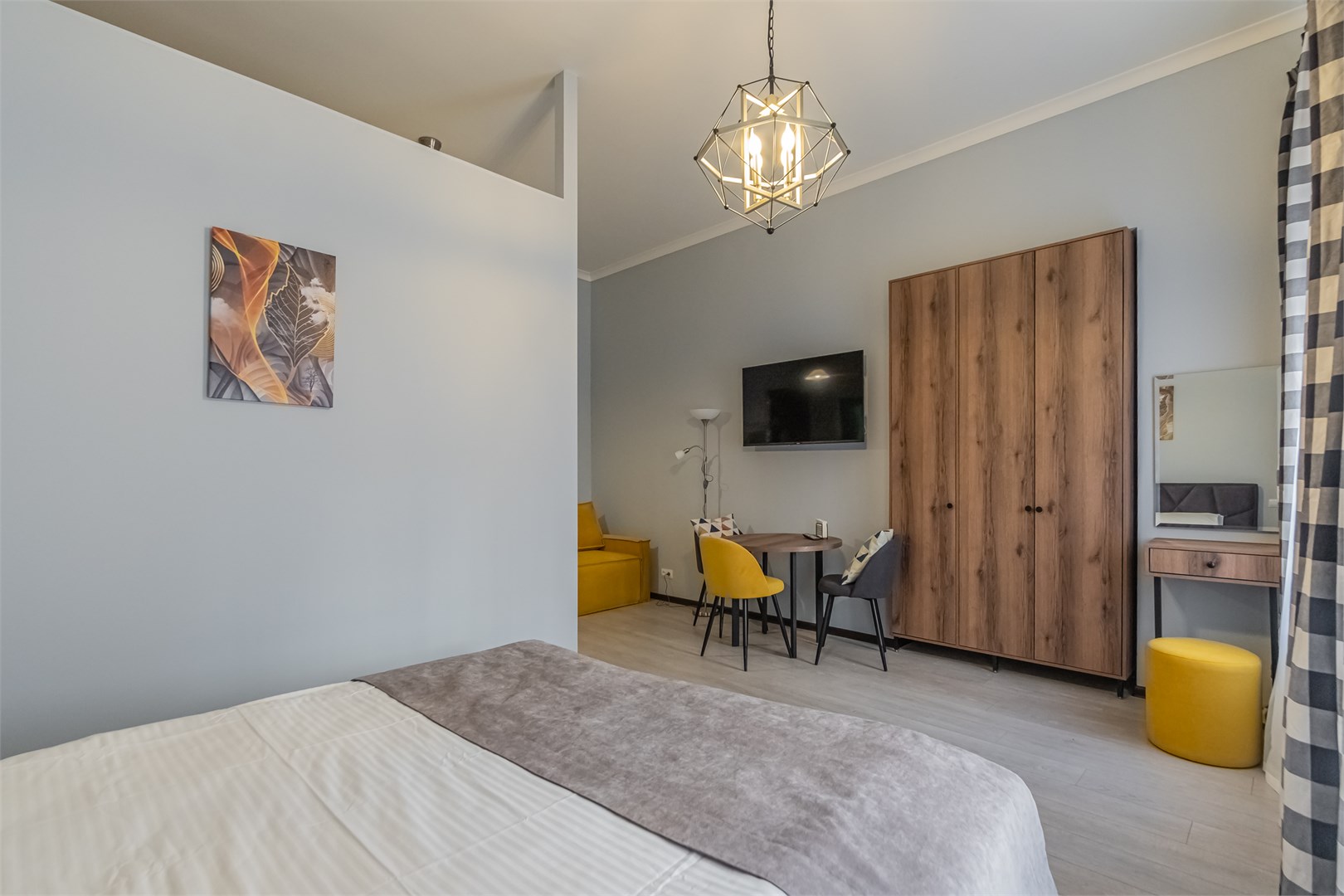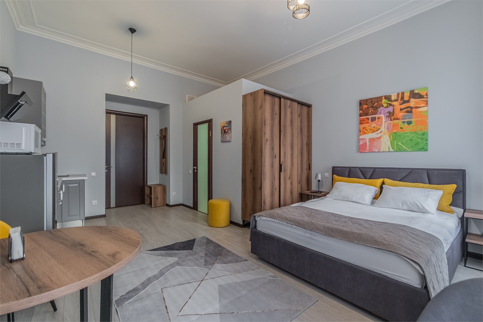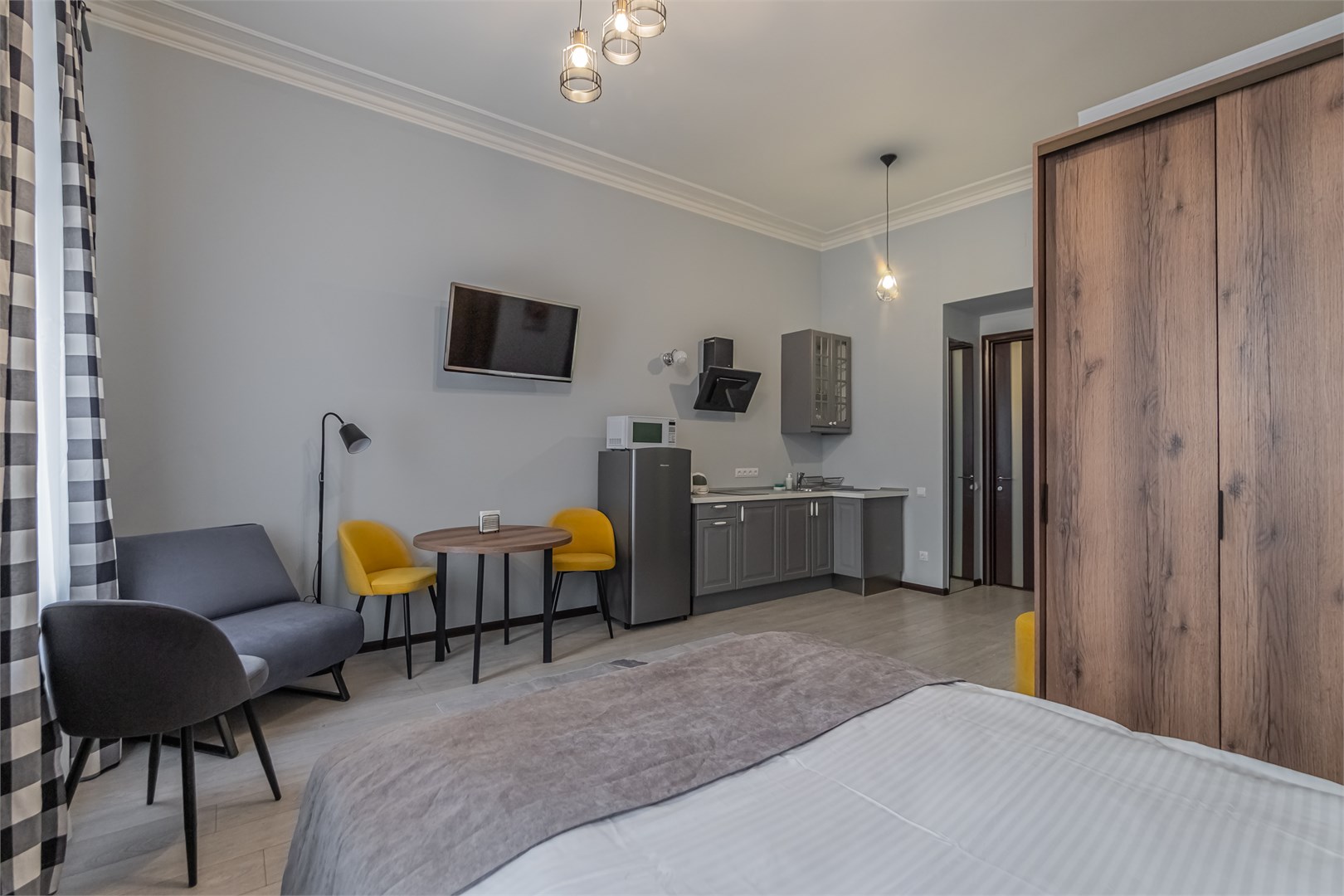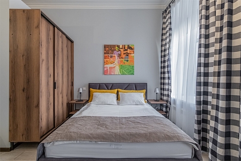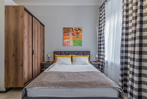 В номере: вешалка, диван, зеркало, кровать двуспальная, прикроватные тумбочки, стол, стулья, шкаф, микроволновая печь, плита электрическая, телевизор, холодильник, электрочайник