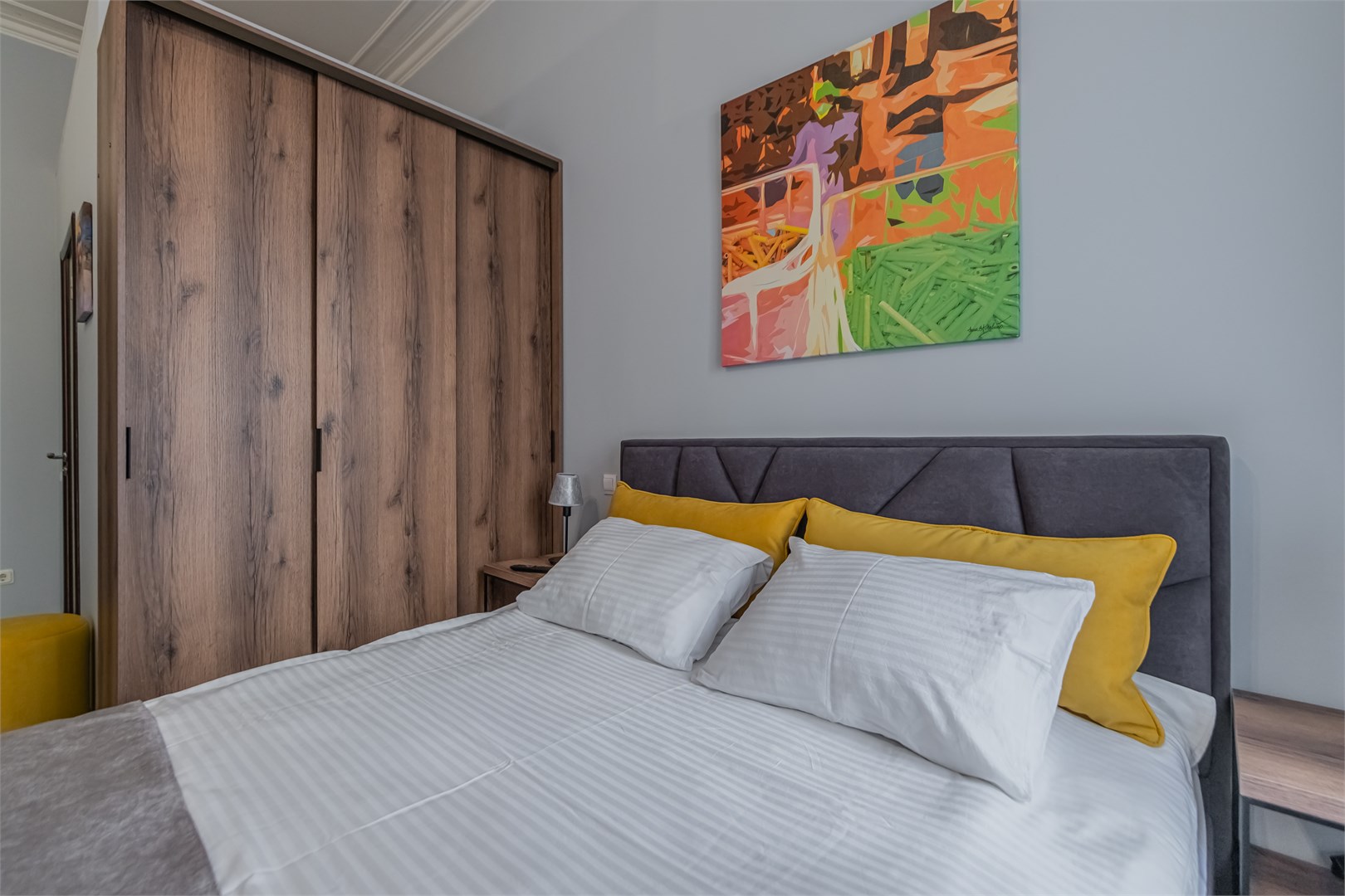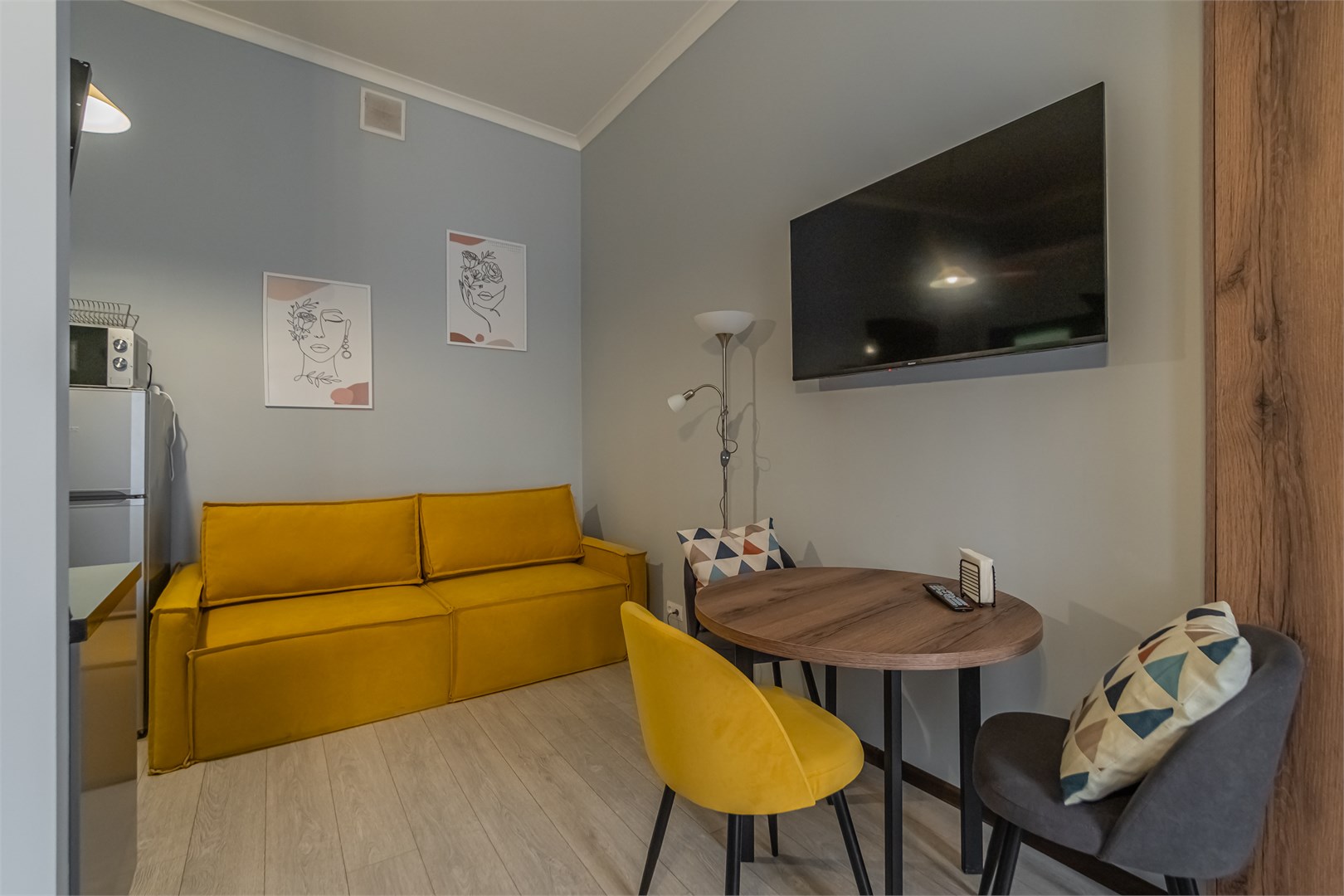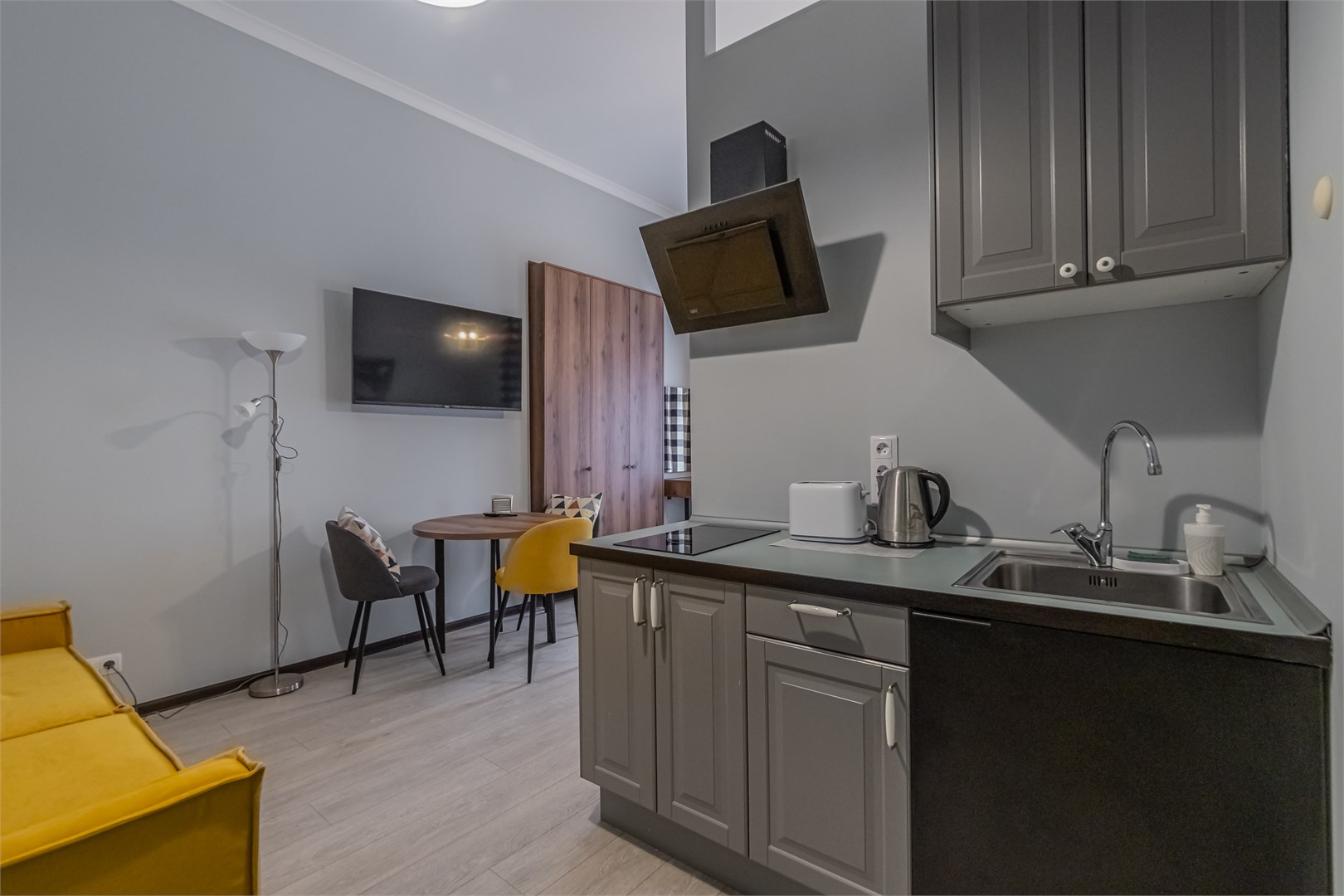 В номере: вешалка, диван, зеркало, кровать двуспальная, прикроватные тумбочки, стол, стулья, шкаф, микроволновая печь, плита электрическая, телевизор, холодильник, электрочайник