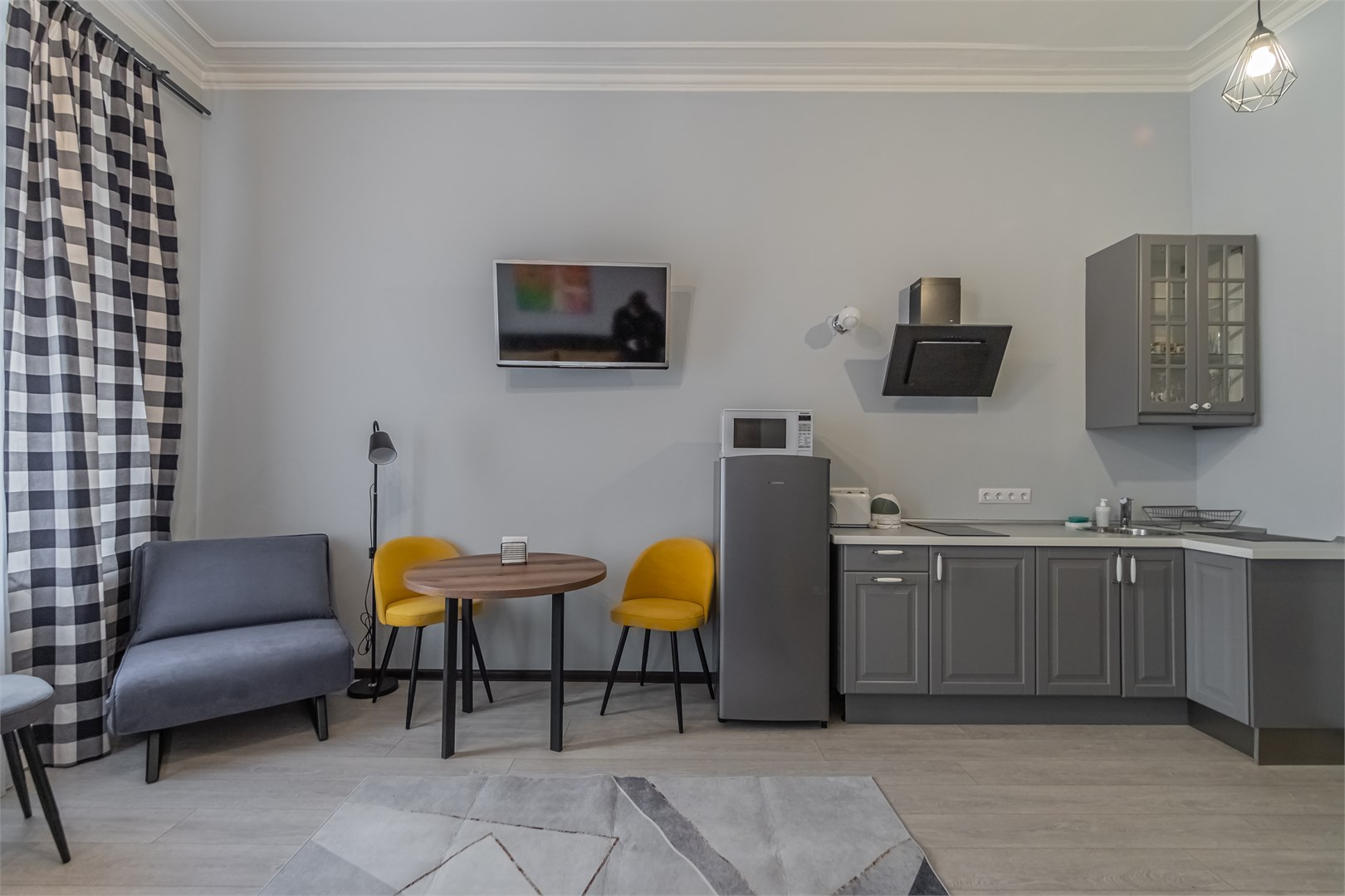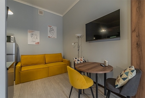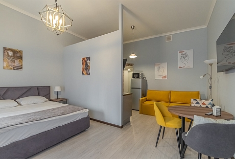 Отель располагается в бывшем доходном доме барона Фредерикса с парковкой во внутреннем дворе. Номерной фонд включает 2 уютные студии, оформленные в сдержанных тонах с яркими деталями. Каждая располагает двуспальной кроватью, одни апартаменты дополнены диваном. Предусмотрено все необходимое для отдыха с комфортом, в наличии мини-кухня и ванная комната. В общей зоне установлена стиральная машина. На всей территории доступно подключение к Wi-Fi.