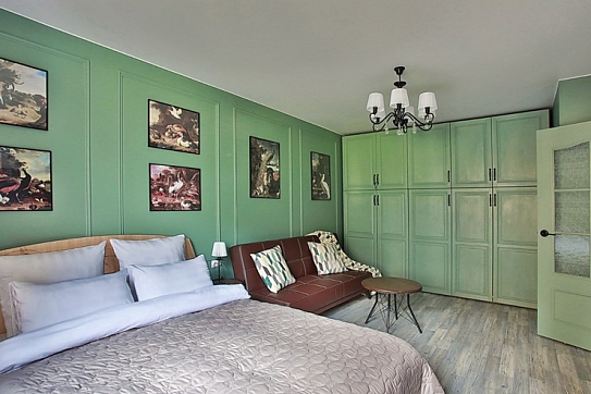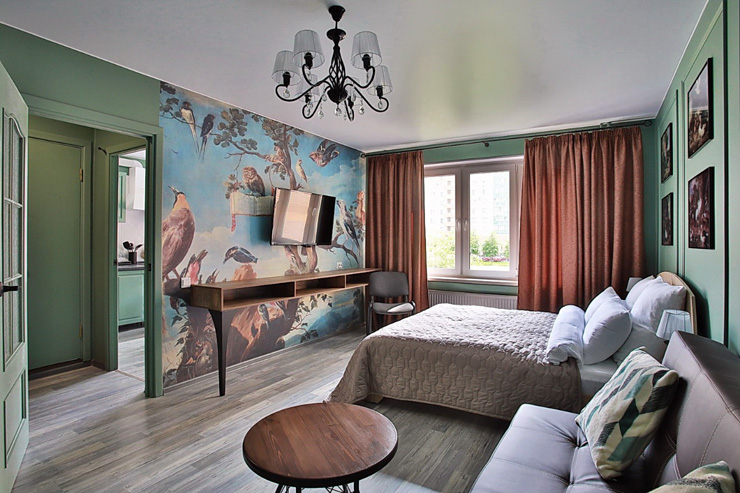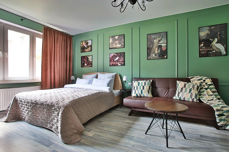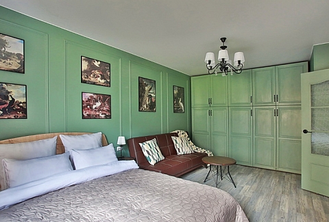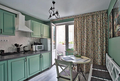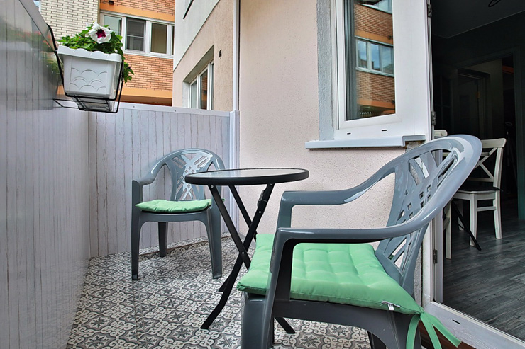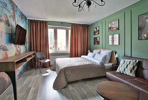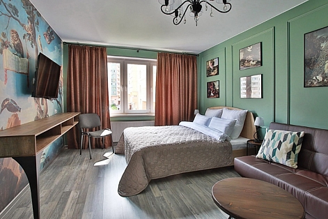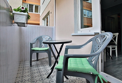 Расстояние до аэропорта и железнодорожного вокзала составляет 13 километров. Апартаменты расположились в 18-этажном жилом доме с лифтом. В комнате установлены большая кровать и диван, в качестве дополнительного спального места. Также есть шкаф, стол и стулья, телевизор с плоским экраном, работает Wi-Fi. Санузел с ванной и стиральной машиной. Гостям предоставляются туалетные принадлежности, полотенца. Для самостоятельного приготовления еды оборудована кухонная зона с холодильником, электрической плитой, чайником, микроволновой печью, набором посуды и столовых приборов. С балкона открывается красивый вид на город. Личный транспорт можно оставить на парковке возле дома.