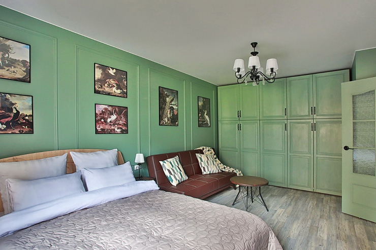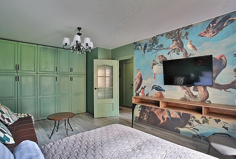 В номере: вешалка, зеркало, кровать двуспальная, прикроватные тумбочки, стол, стулья, шкаф, гладильная доска, микроволновая печь, набор посуды, плита электрическая, стиральная машина, телевизор, утюг, холодильник, электрочайник