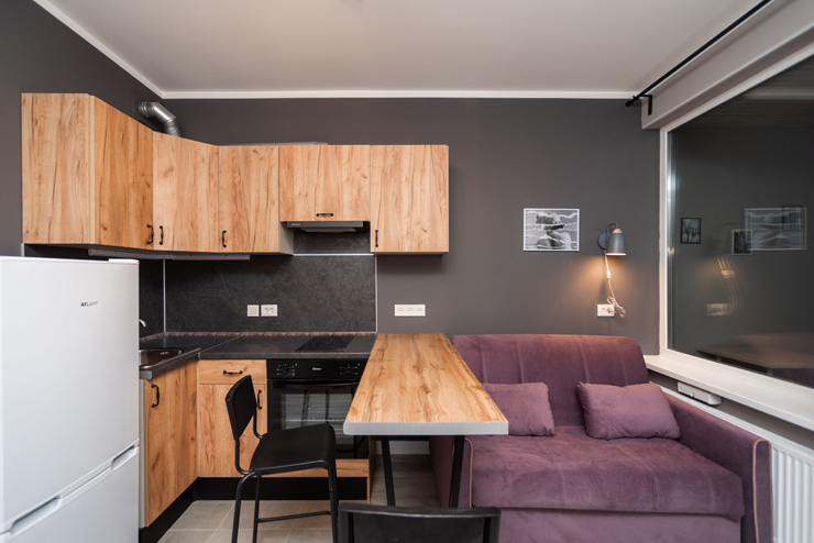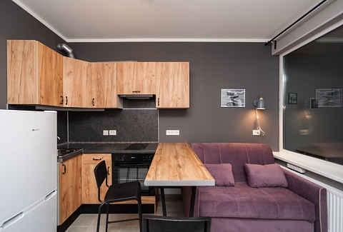 В номере: диван раскладной, кровать двуспальная, стол, стулья, духовой шкаф, микроволновая печь, плита электрическая, стиральная машина, телевизор, теплый пол, холодильник, электрочайник
