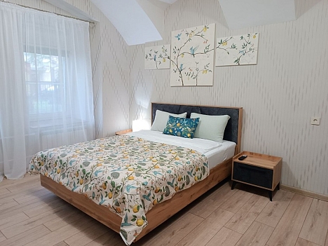 В номере: вешалка, диван раскладной, зеркало, кровать двуспальная, прикроватные тумбочки, стол, стулья, шкаф, гладильная доска, микроволновая печь, мини-холодильник, набор посуды, плита электрическая, посудомоечная машина, стиральная машина, сушилка для белья, телевизор, утюг, электрочайник