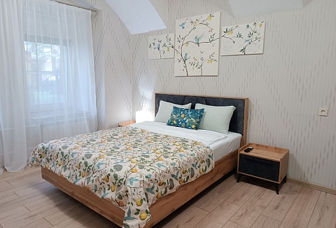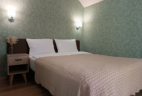 В номере: вешалка, диван раскладной, зеркало, кровать двуспальная, прикроватные тумбочки, стол, стулья, шкаф, гладильная доска, микроволновая печь, мини-холодильник, набор посуды, плита электрическая, посудомоечная машина, стиральная машина, сушилка для белья, телевизор, утюг, электрочайник