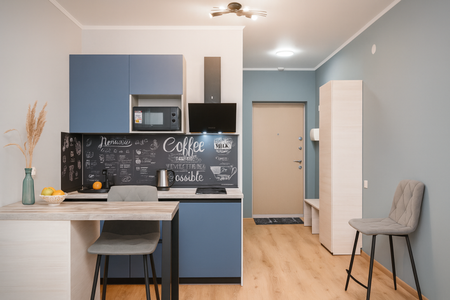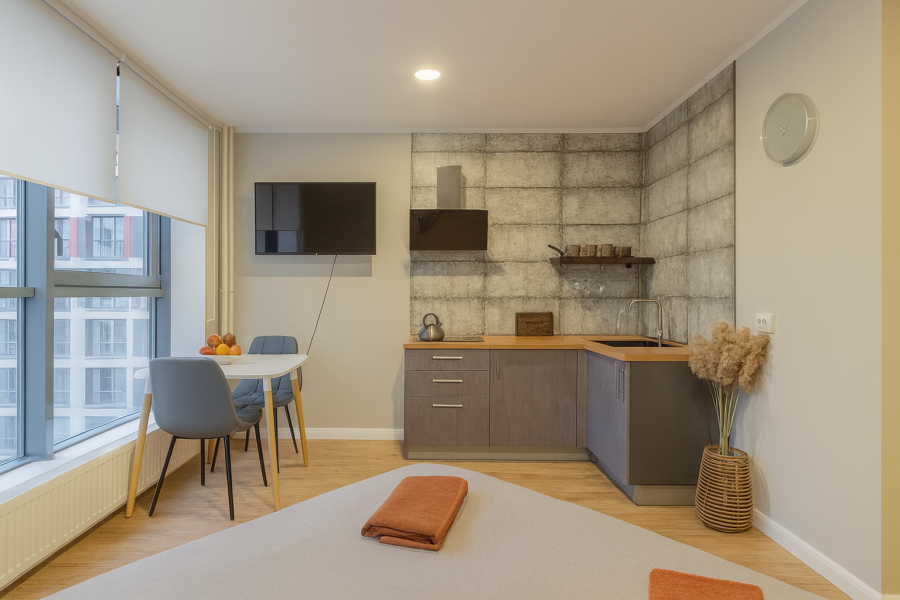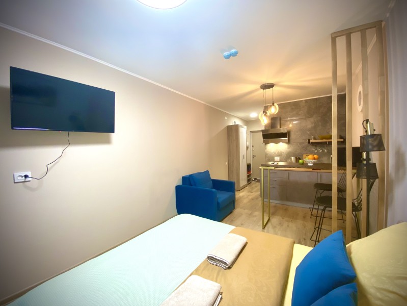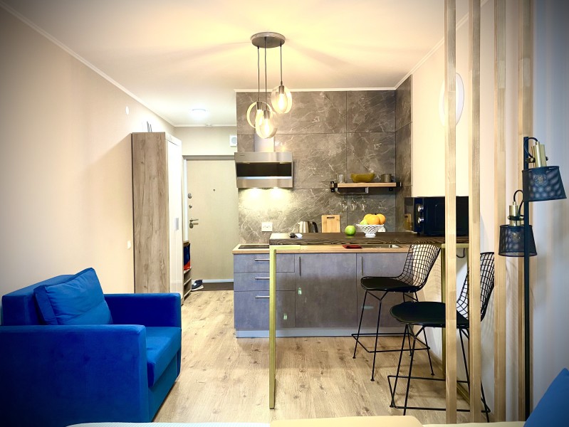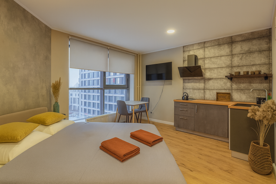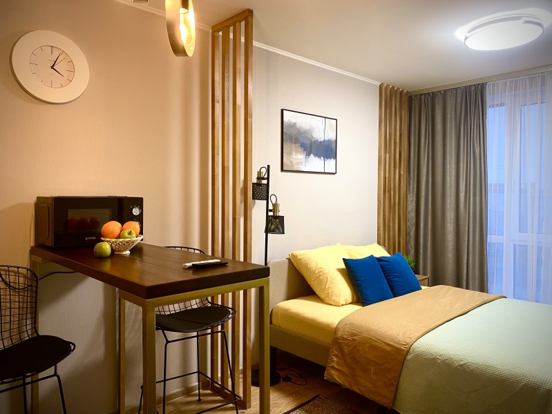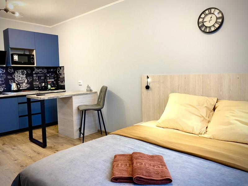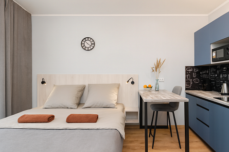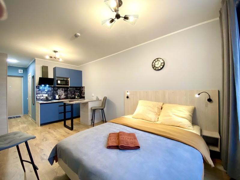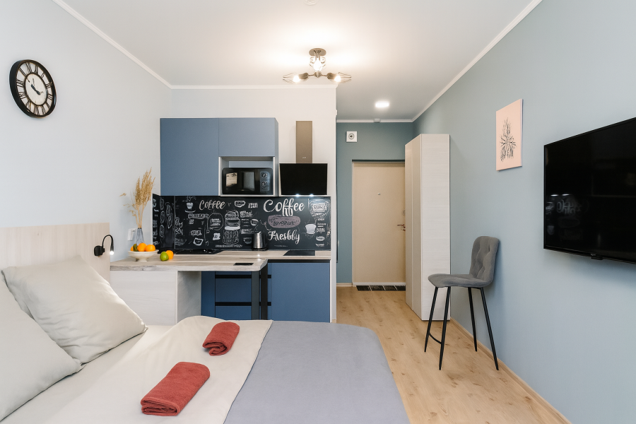 Апартаменты START расположены в жилом комплексе с развитой инфраструктурой. Общественные зоны оборудованы круглосуточным видеонаблюдением.Для проживания предлагается несколько категорий апартаментов. Все варианты имеют мини-кухню с базовой техникой: варочная панель, вытяжка, микроволновая печь, холодильник, стиральная машина и электрочайник.