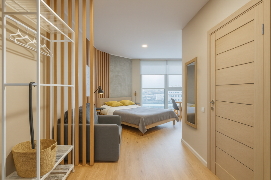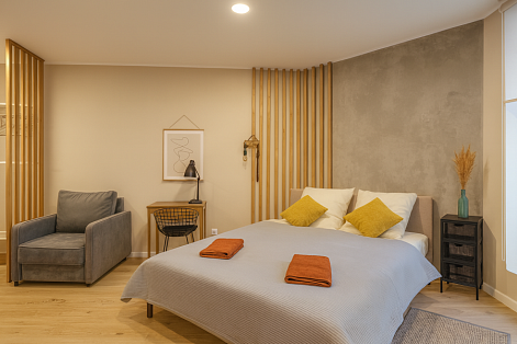 В жилой зоне расположены рабочие места, телевизоры с функцией Smart TV, а также кровати с ортопедическими матрасами, которые могут быть односпальными или объединяться в двуспальные.В апартаментах обеспечена качественная шумоизоляция, установлены блэкаут-шторы для комфортного сна. Помещения оснащены достаточным количеством розеток и выключателей для бытовых нужд. На всей территории предоставляется высокоскоростной Wi-Fi и цифровое телевидение. Лобби-зона оборудована удобными местами для отдыха и ожидания.