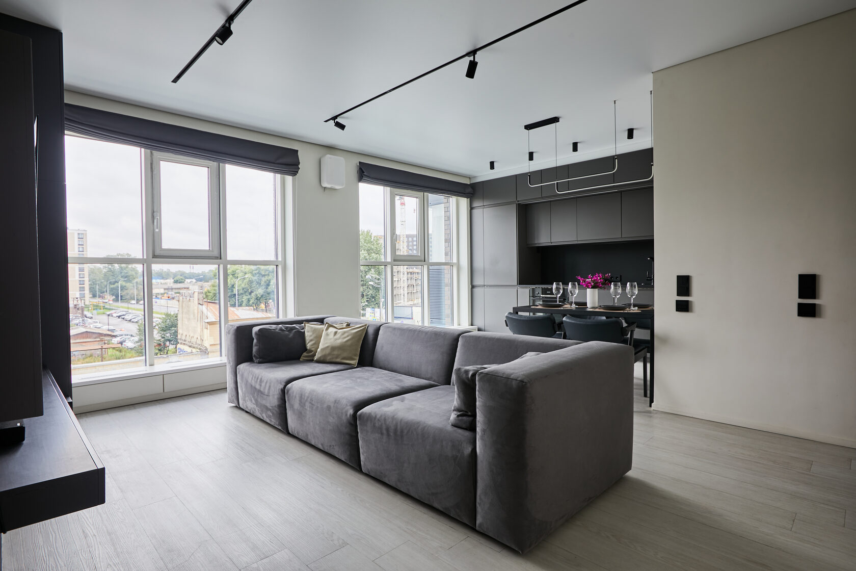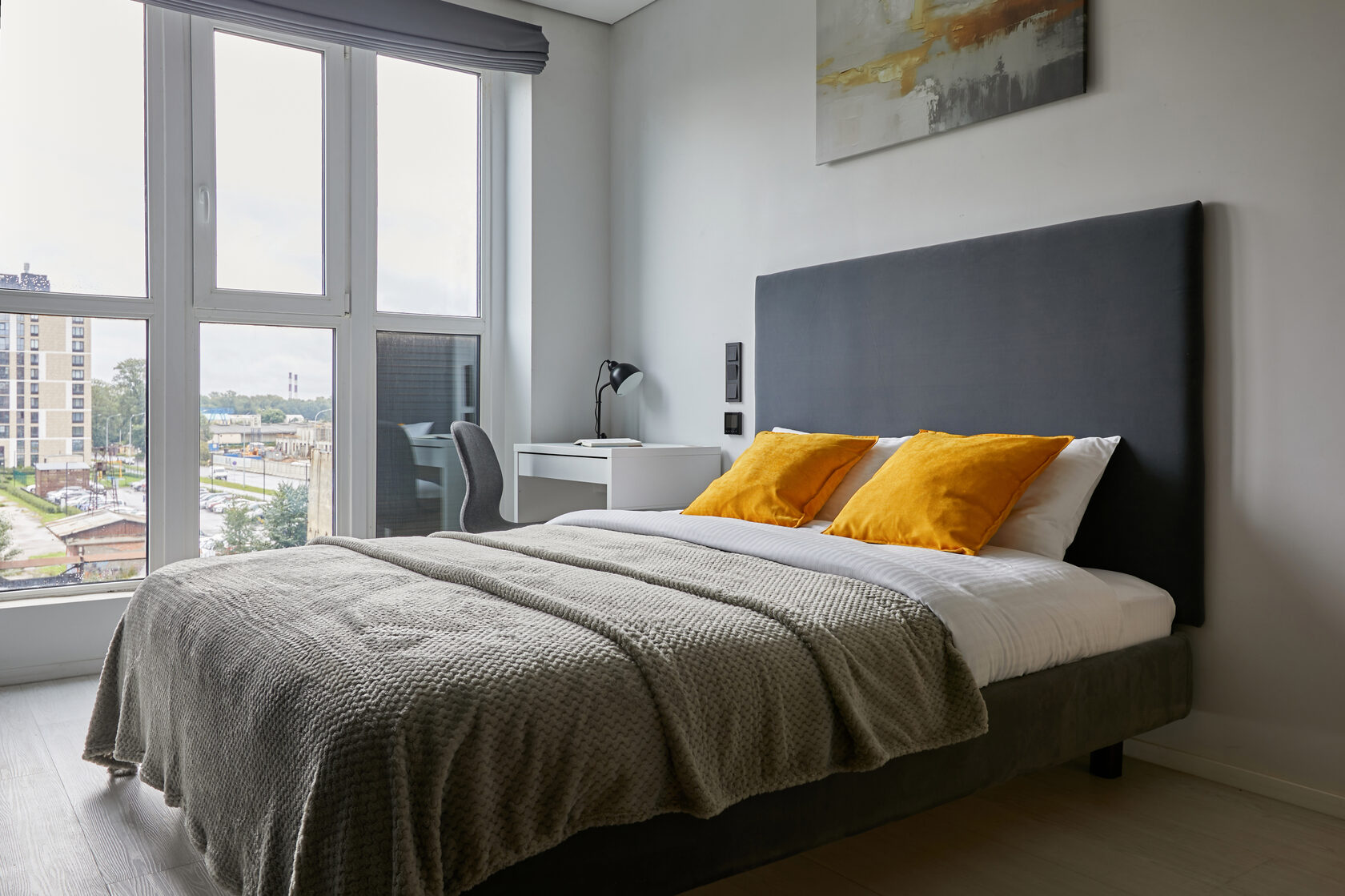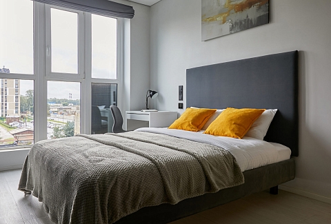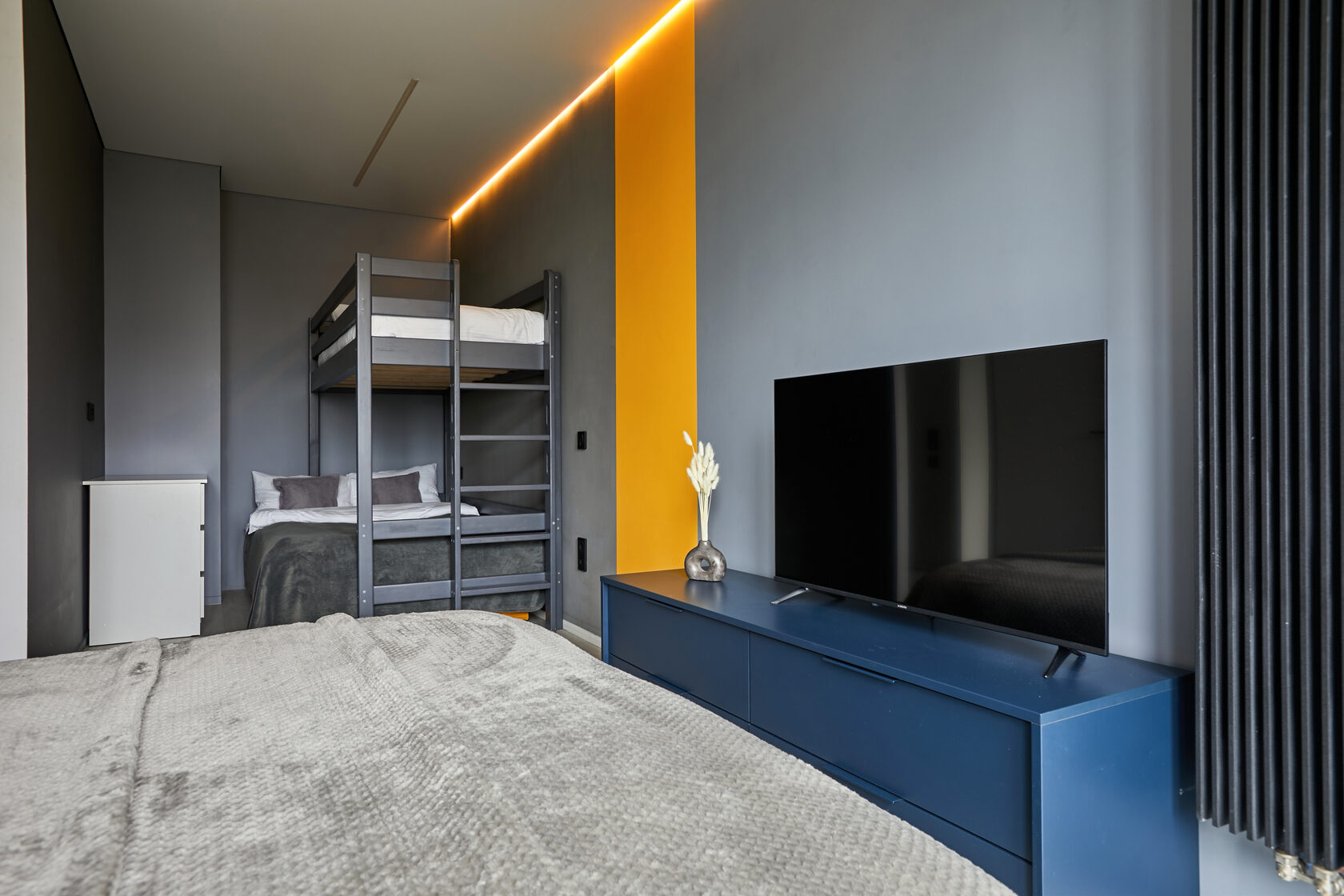 Обустроены вместительные парковки. На первом этаже работают магазины и кафе.Изолированная спальня предусмотрена для размещения 4 гостей: установлены двуспальная и двухъярусная кровати. Просторная кухня-гостиная располагает функциональной зоной для приготовления еды, посудомоечной машиной, обеденной группой со столом и мягкими стульями, большим раскладным диваном. Оснащена отдельная гардеробная комната с полками для вещей и стиральной машиной. Санузел совмещен с душевой. Можно подключиться к Wi-Fi. По запросу предоставляются детский манеж, стульчик для кормления, горшок.