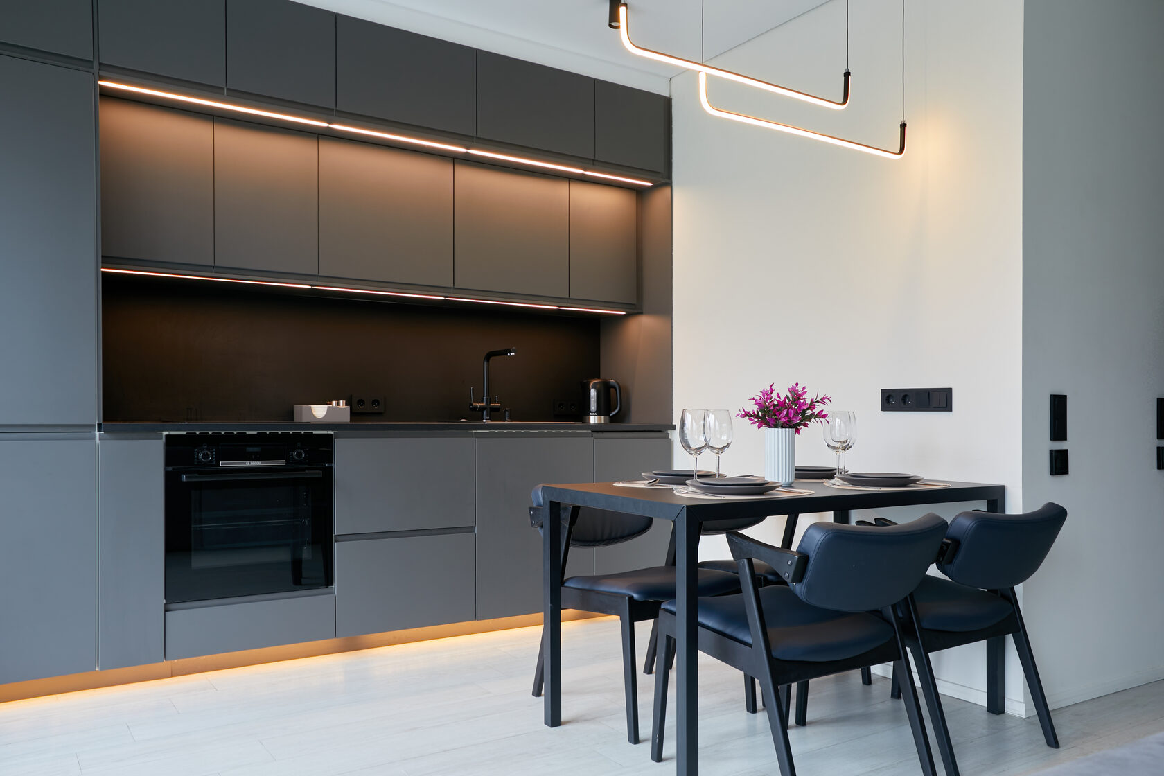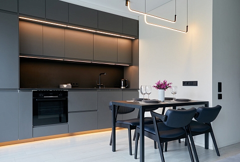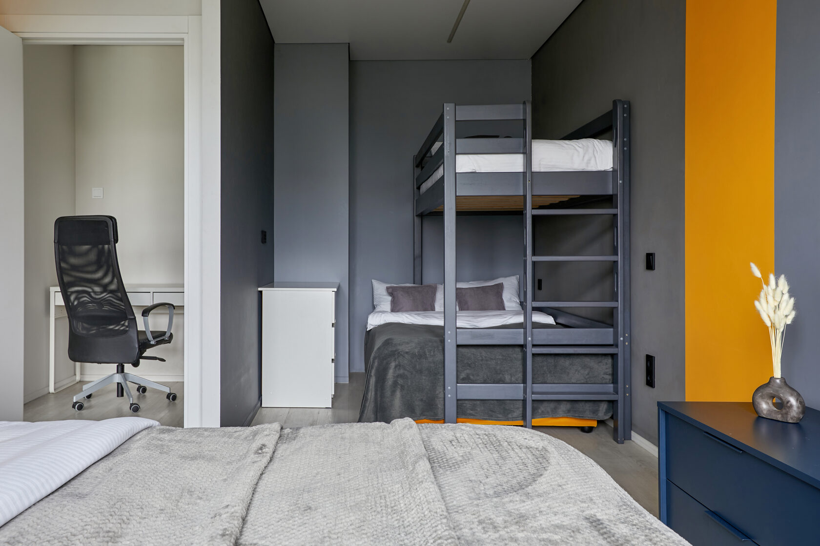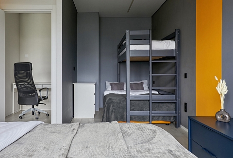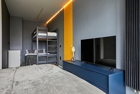 В номере: гардеробная, диван раскладной, зеркало, комод, кровать двуспальная, кровать двухъярусная, кухонная мебель, прикроватные тумбочки, стол, стол обеденный, стулья, климатическая система, микроволновая печь, набор посуды, плита электрическая, посудомоечная машина, стиральная машина, телевизор, холодильник, чайный набор посуды, электрочайник