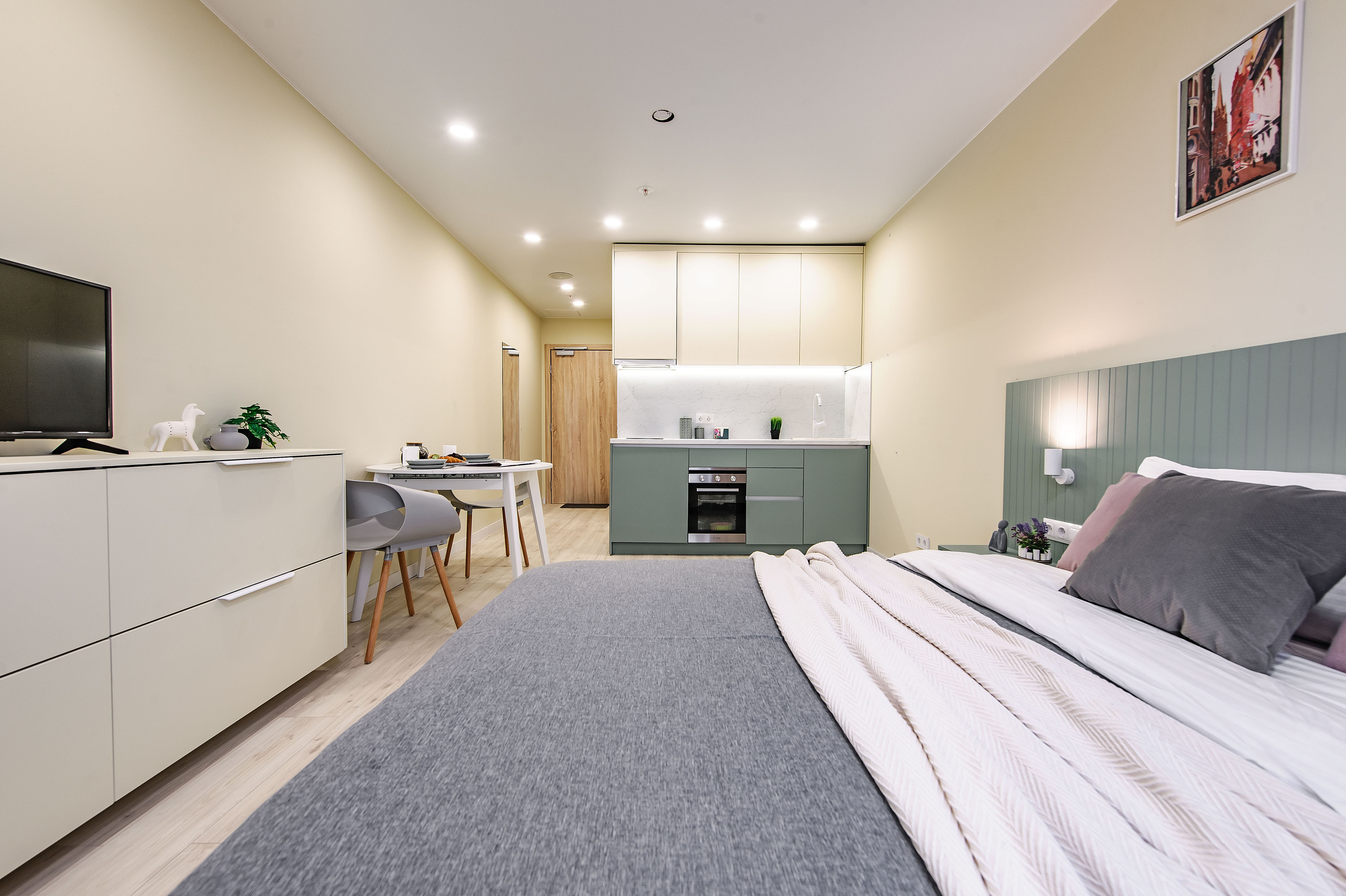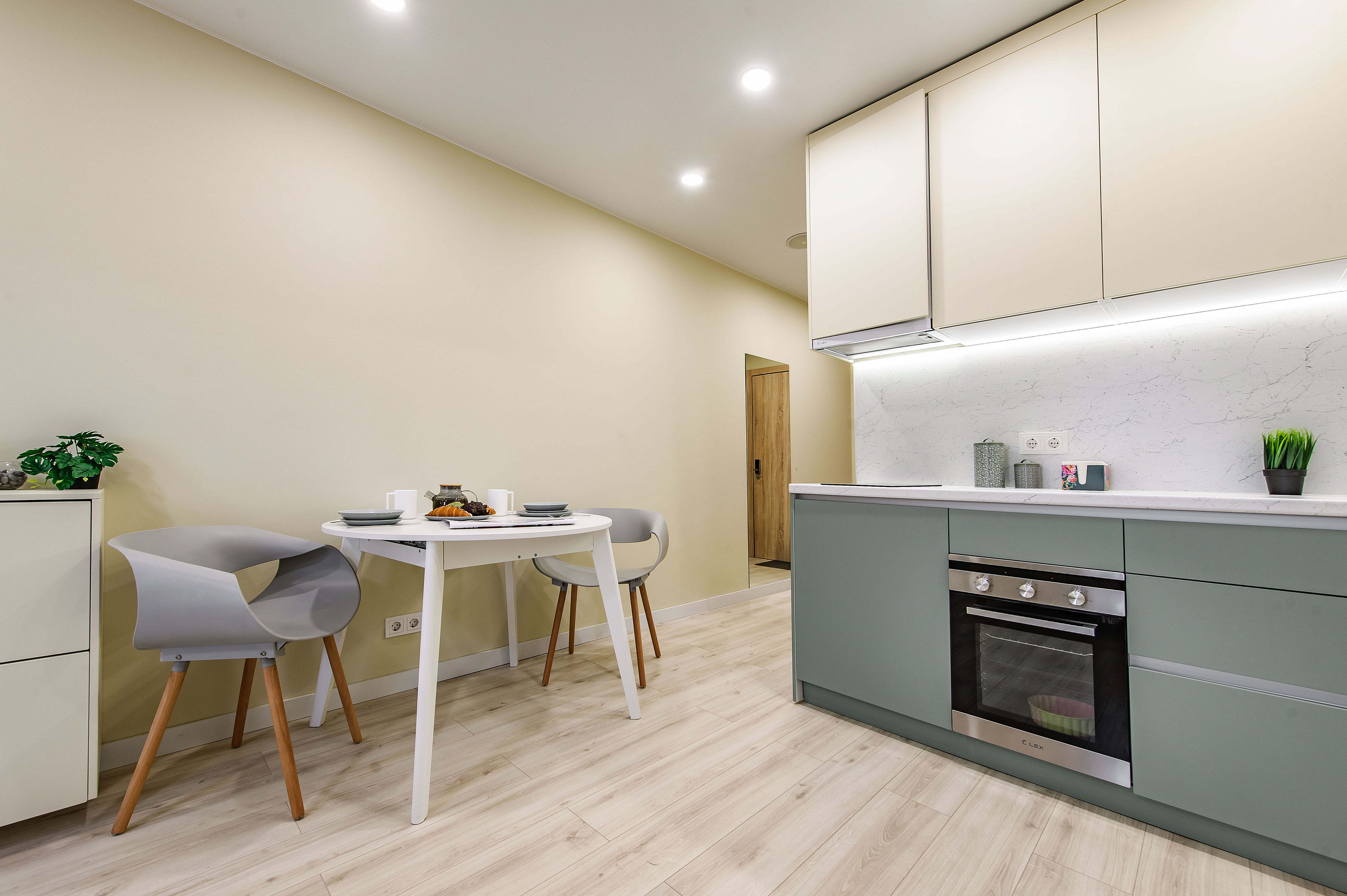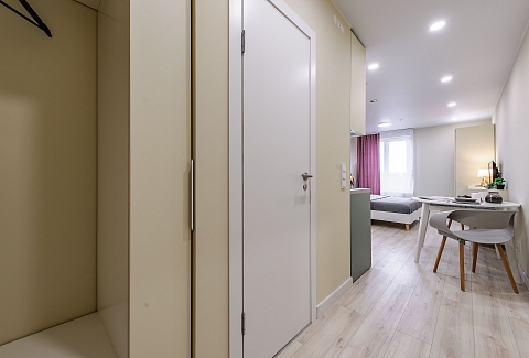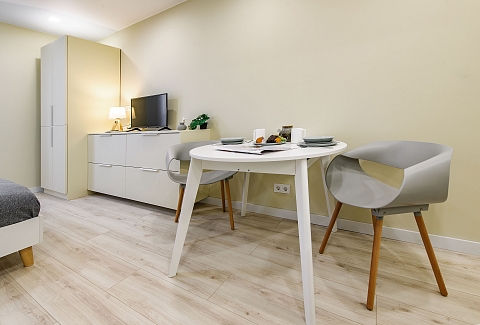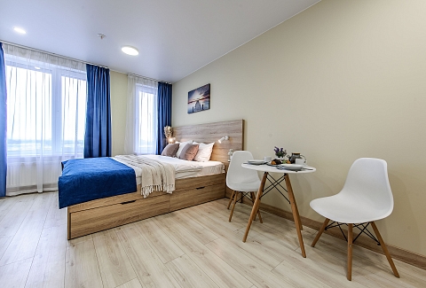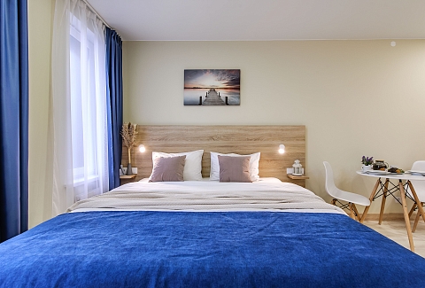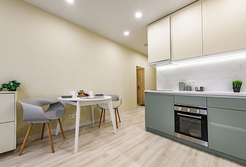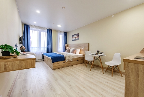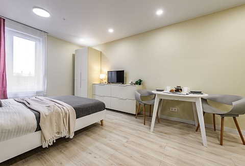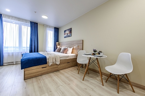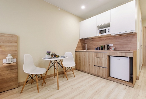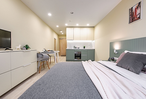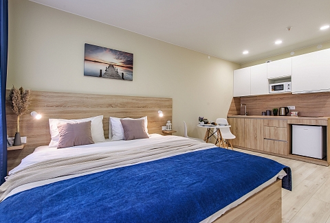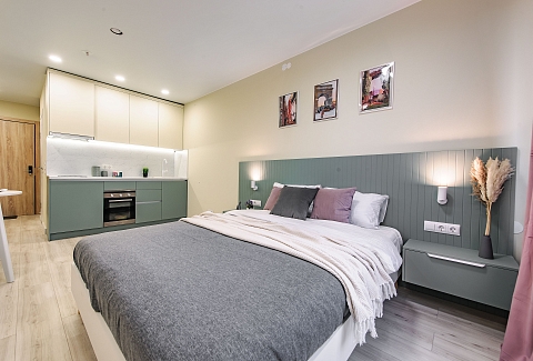 Это 2 студии с дизайнерским ремонтом в теплой цветовой гамме. В номерах установлены большие двуспальные кровати, оборудованы кухонные и обеденные зоны, ванные комнаты оснащены гигиеническими средствами. К услугам проживающих — вся необходимая мебель и техника, включая гладильные принадлежности, стиральную машину и сейф. Работает Wi-Fi.