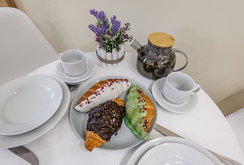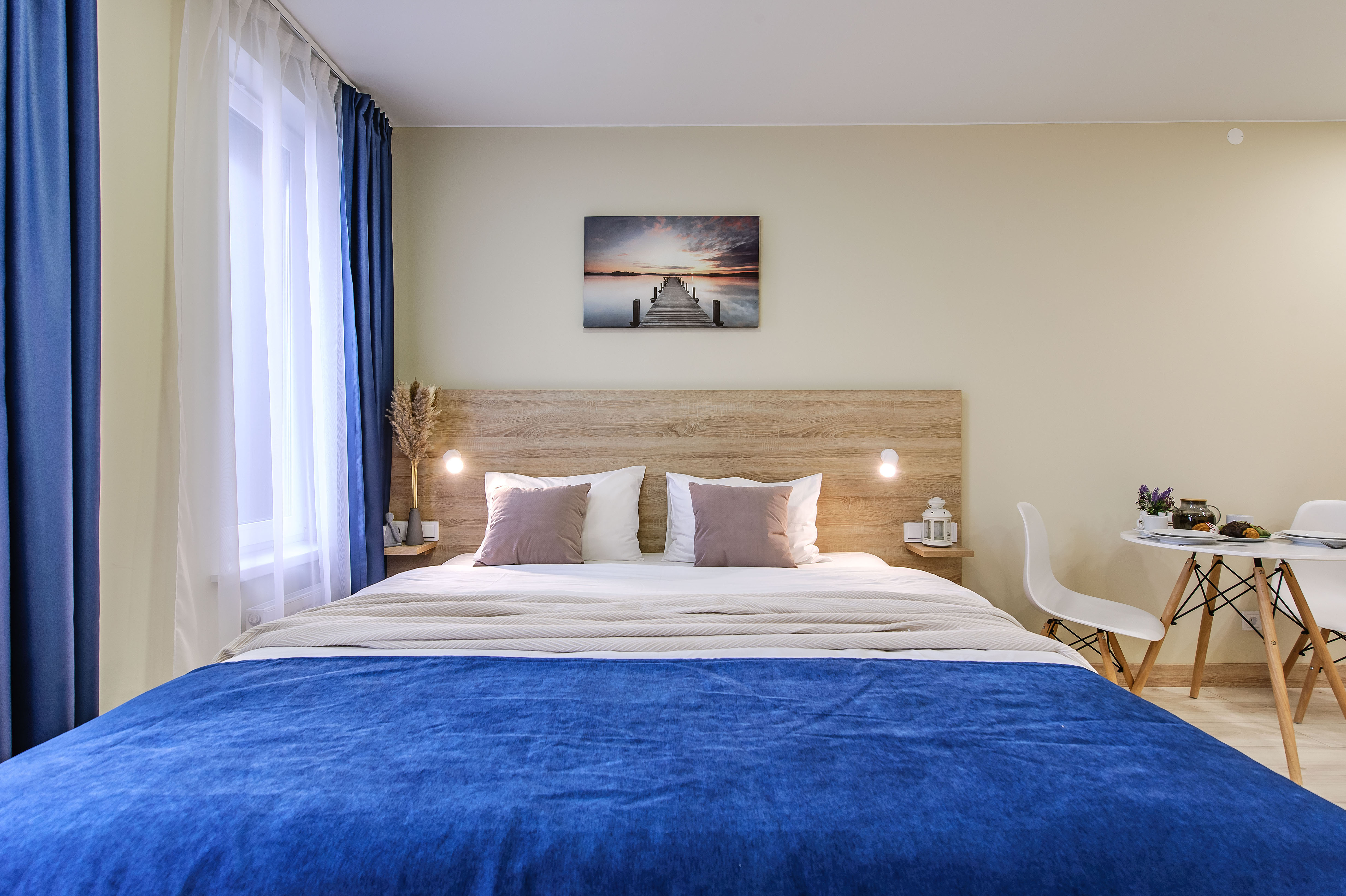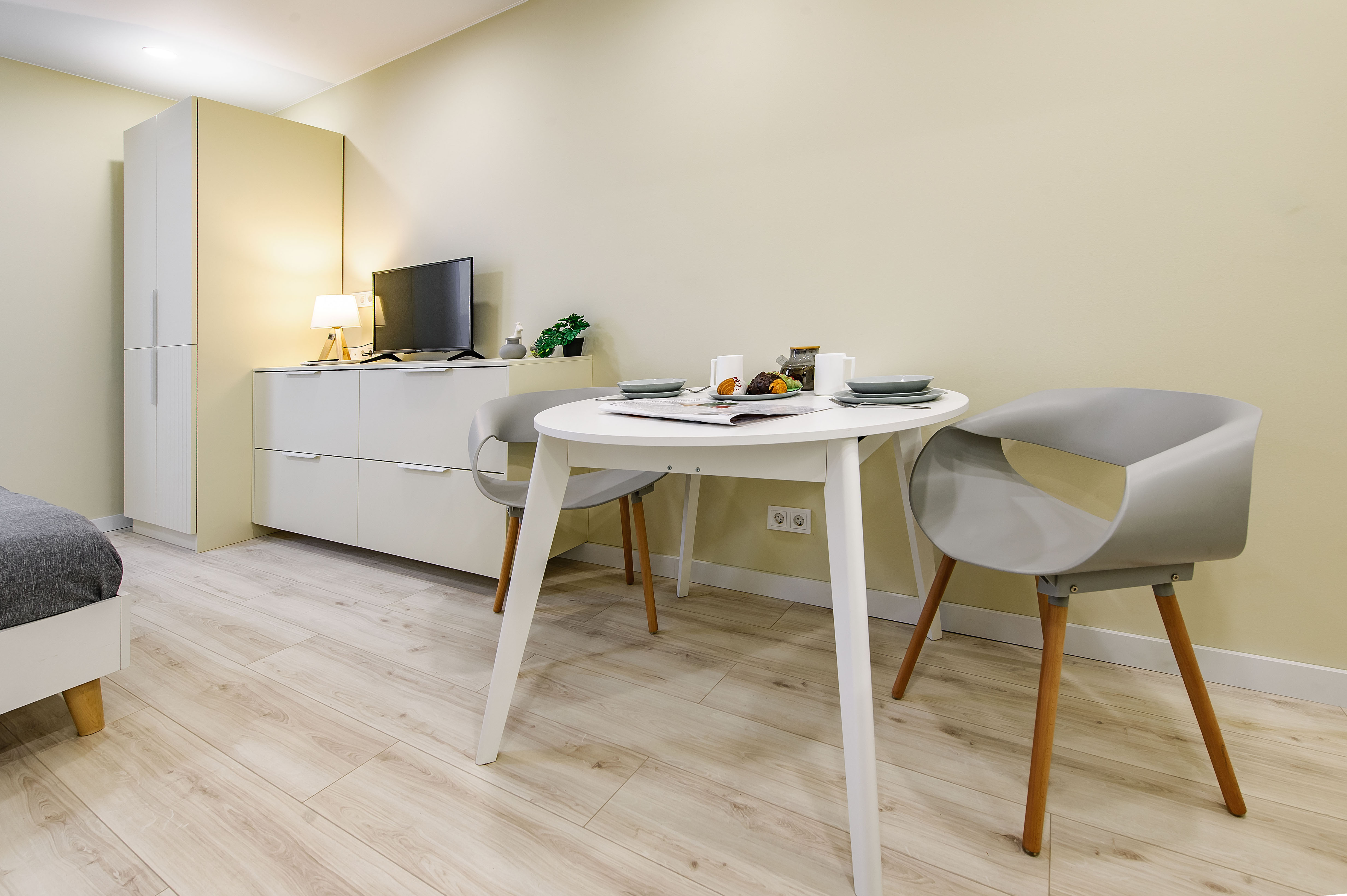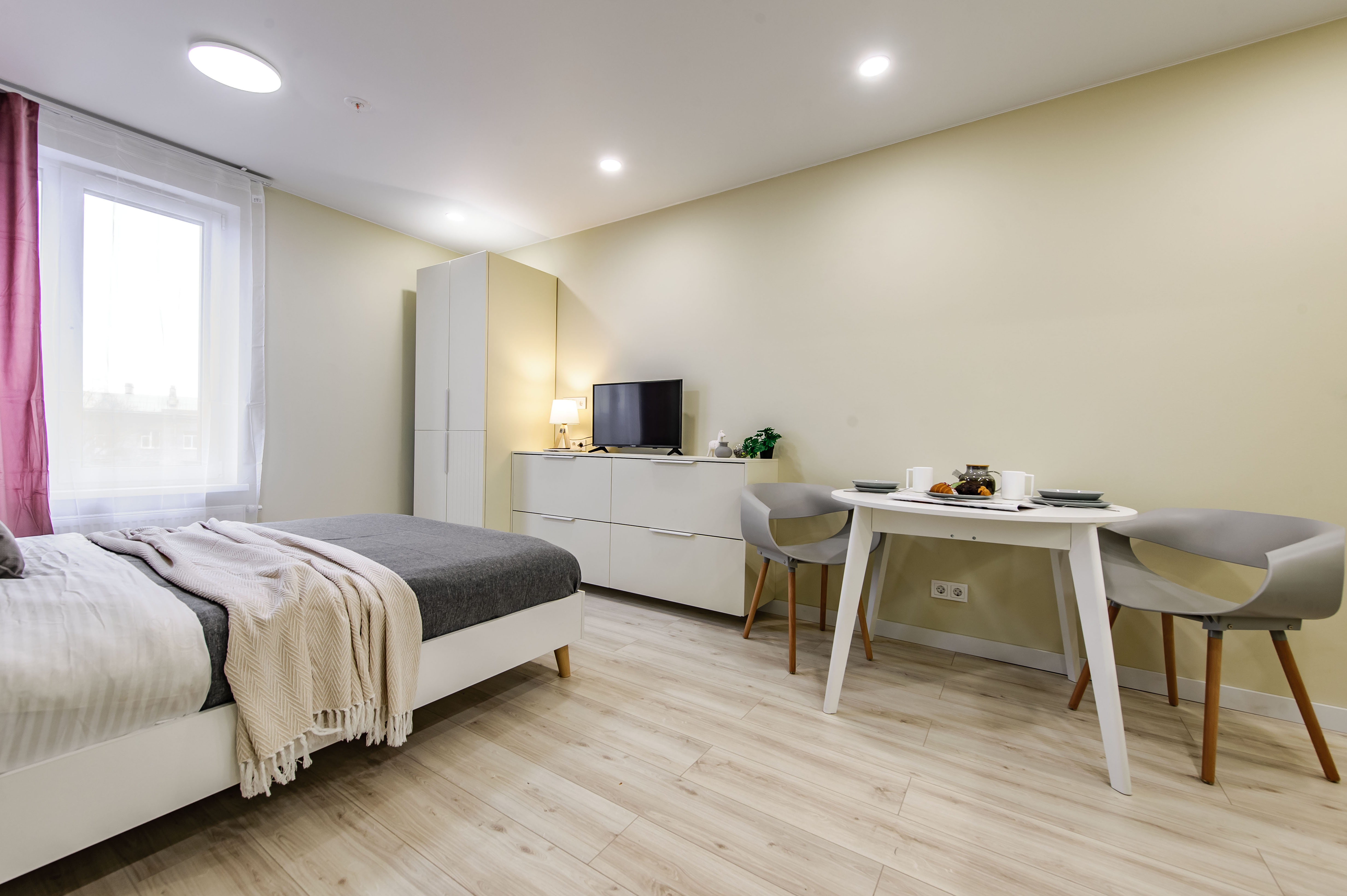 Это 2 студии с дизайнерским ремонтом в теплой цветовой гамме. В номерах установлены большие двуспальные кровати, оборудованы кухонные и обеденные зоны, ванные комнаты оснащены гигиеническими средствами. К услугам проживающих — вся необходимая мебель и техника, включая гладильные принадлежности, стиральную машину и сейф. Работает Wi-Fi.