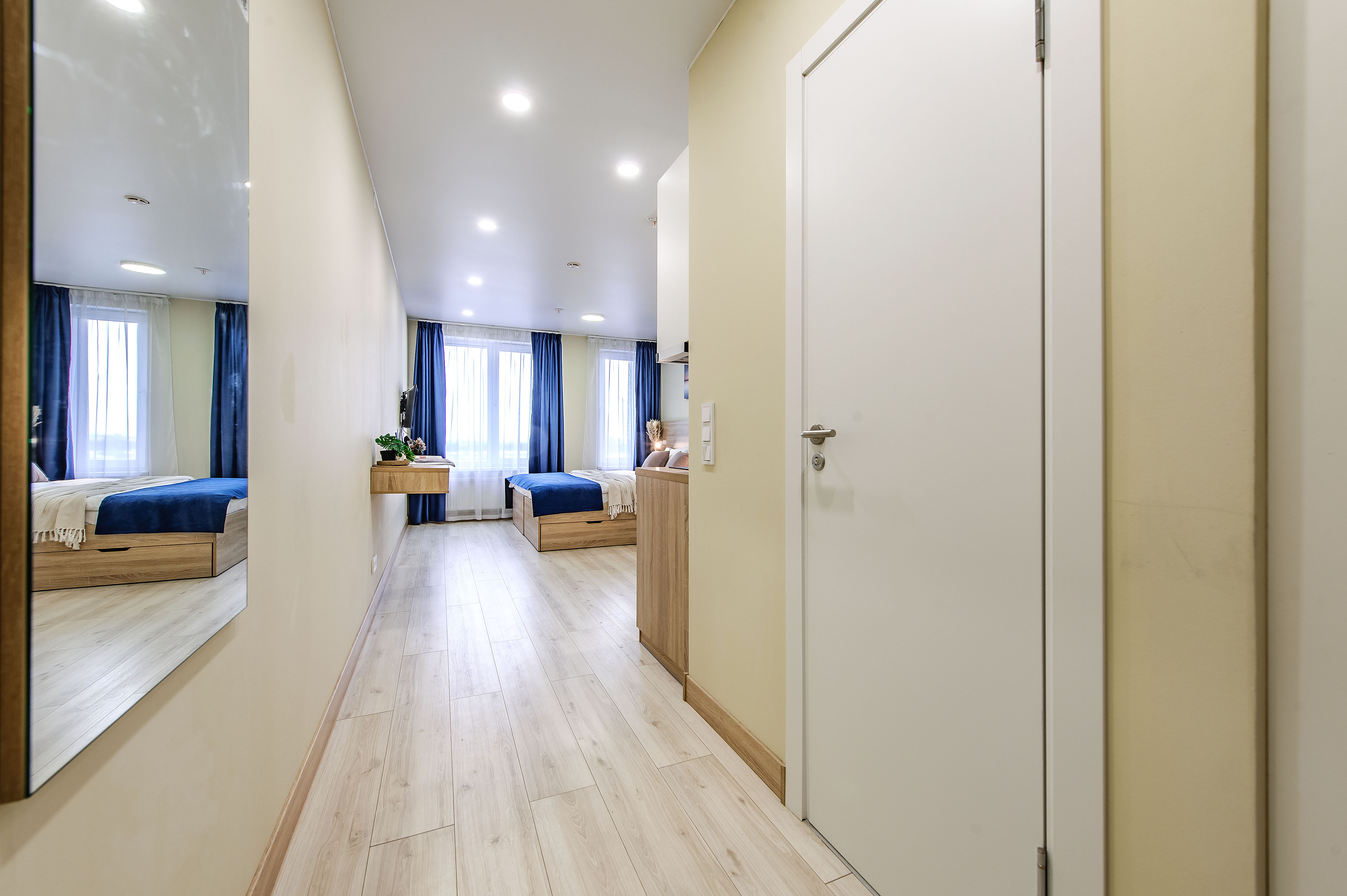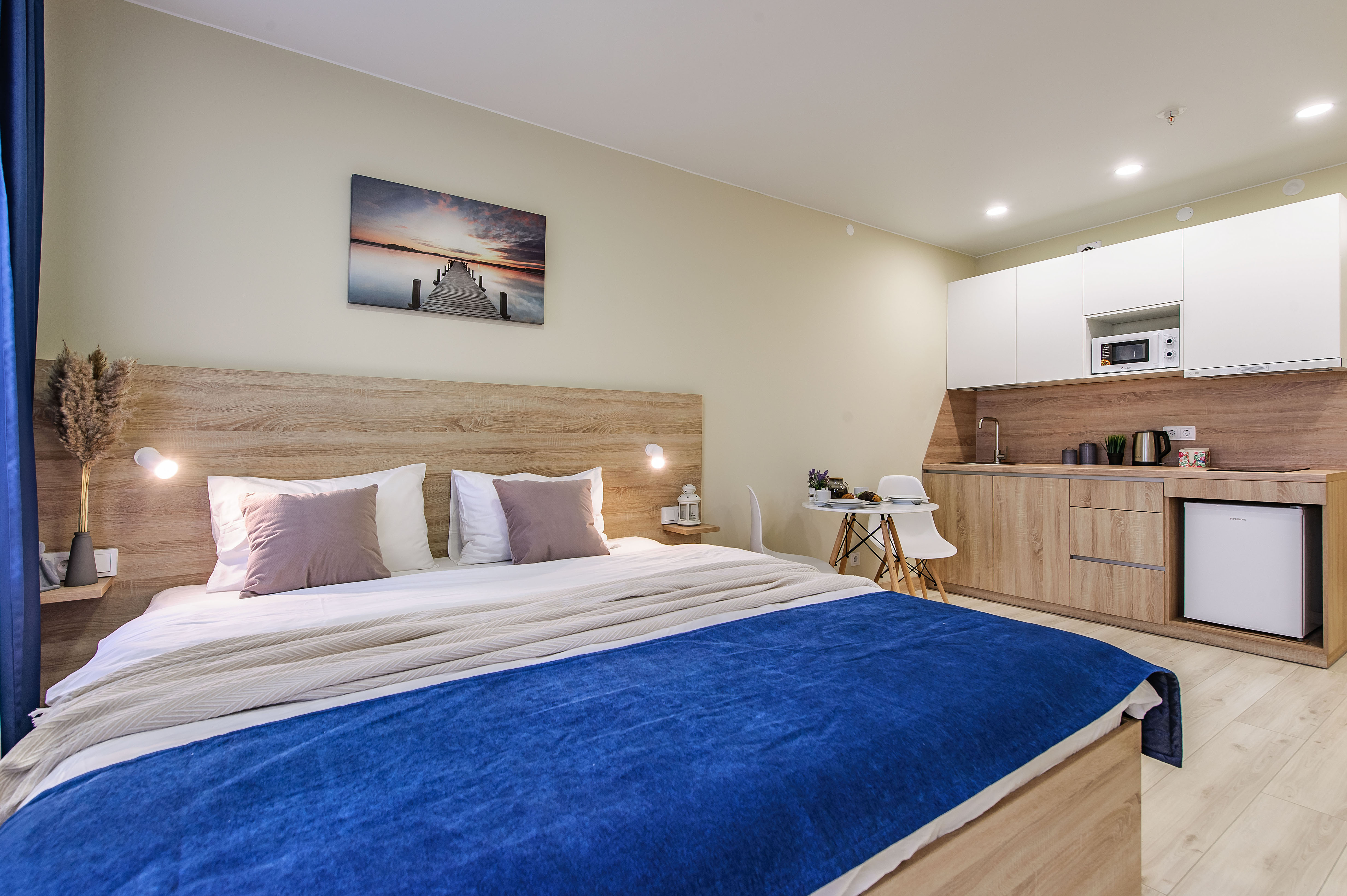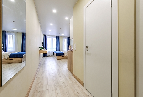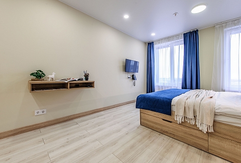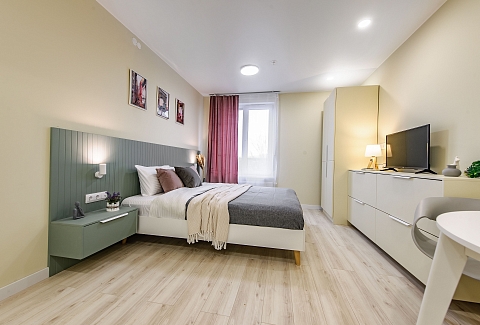 В номере: вешалка, зеркало, кровать двуспальная, кухонная мебель, прикроватные столики, стол обеденный, стулья, шкаф, микроволновая печь, набор посуды, плита электрическая, сейф, стиральная машина, телевизор, утюг, холодильник, чайный набор посуды, электрочайник