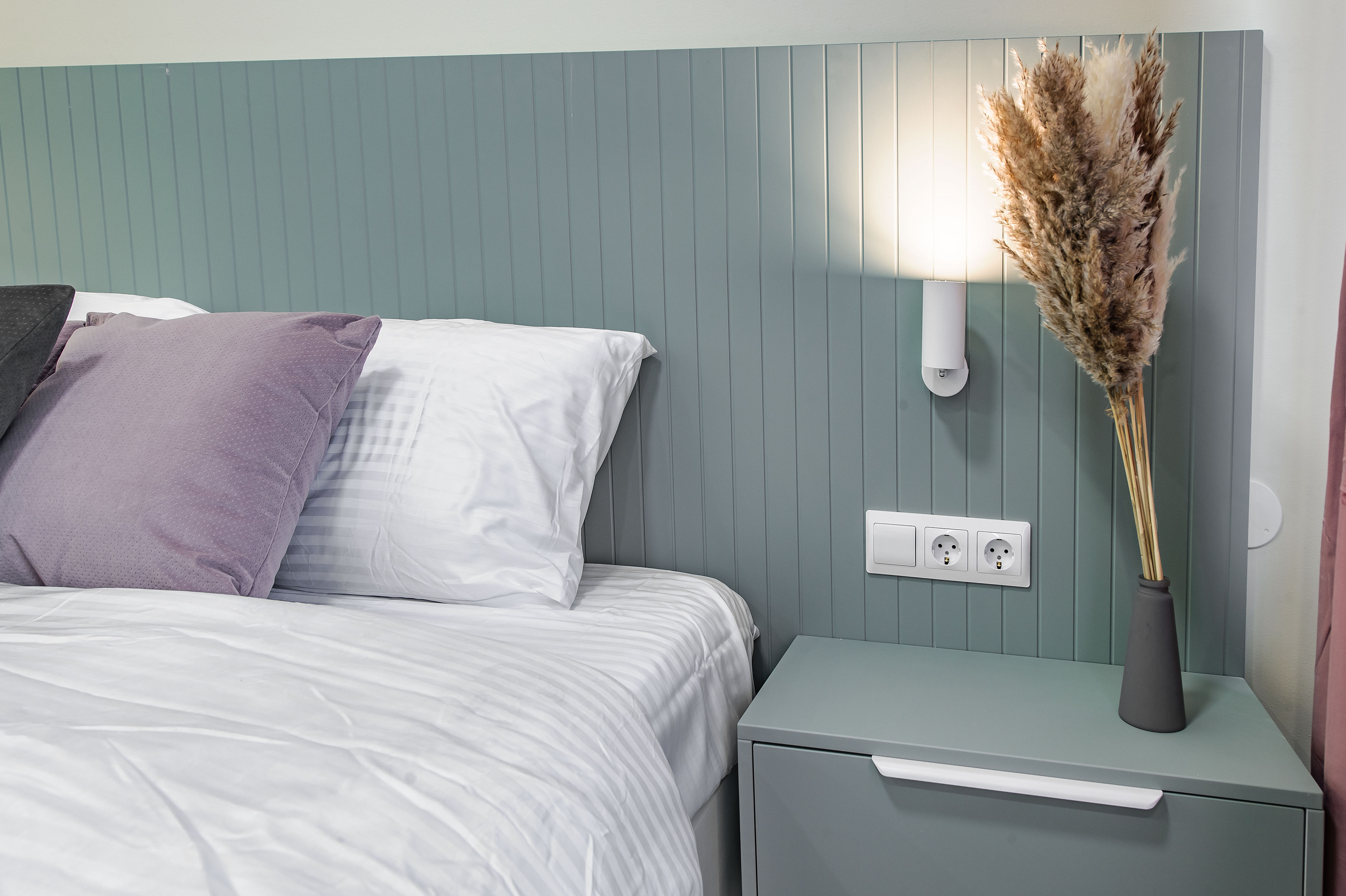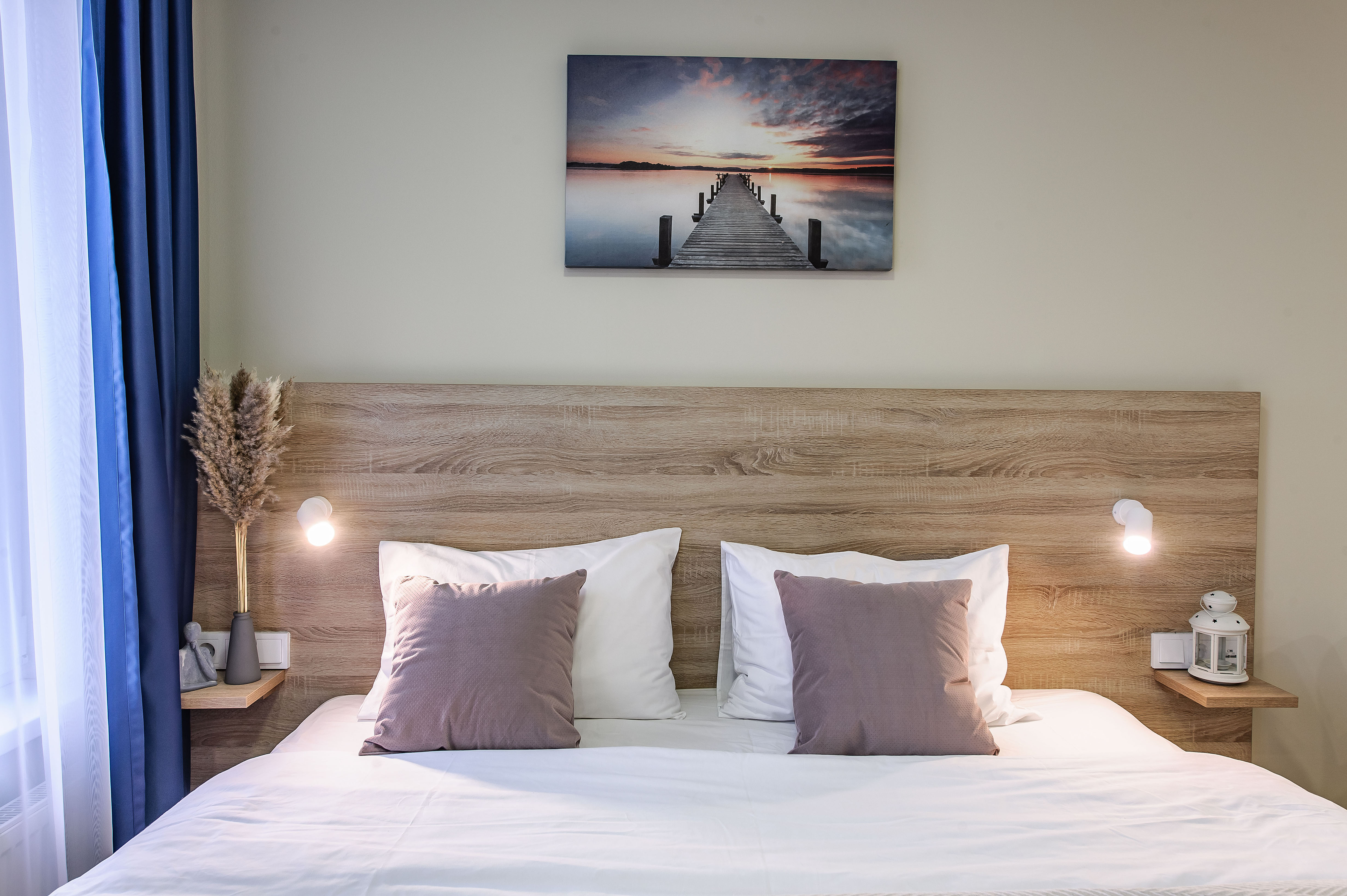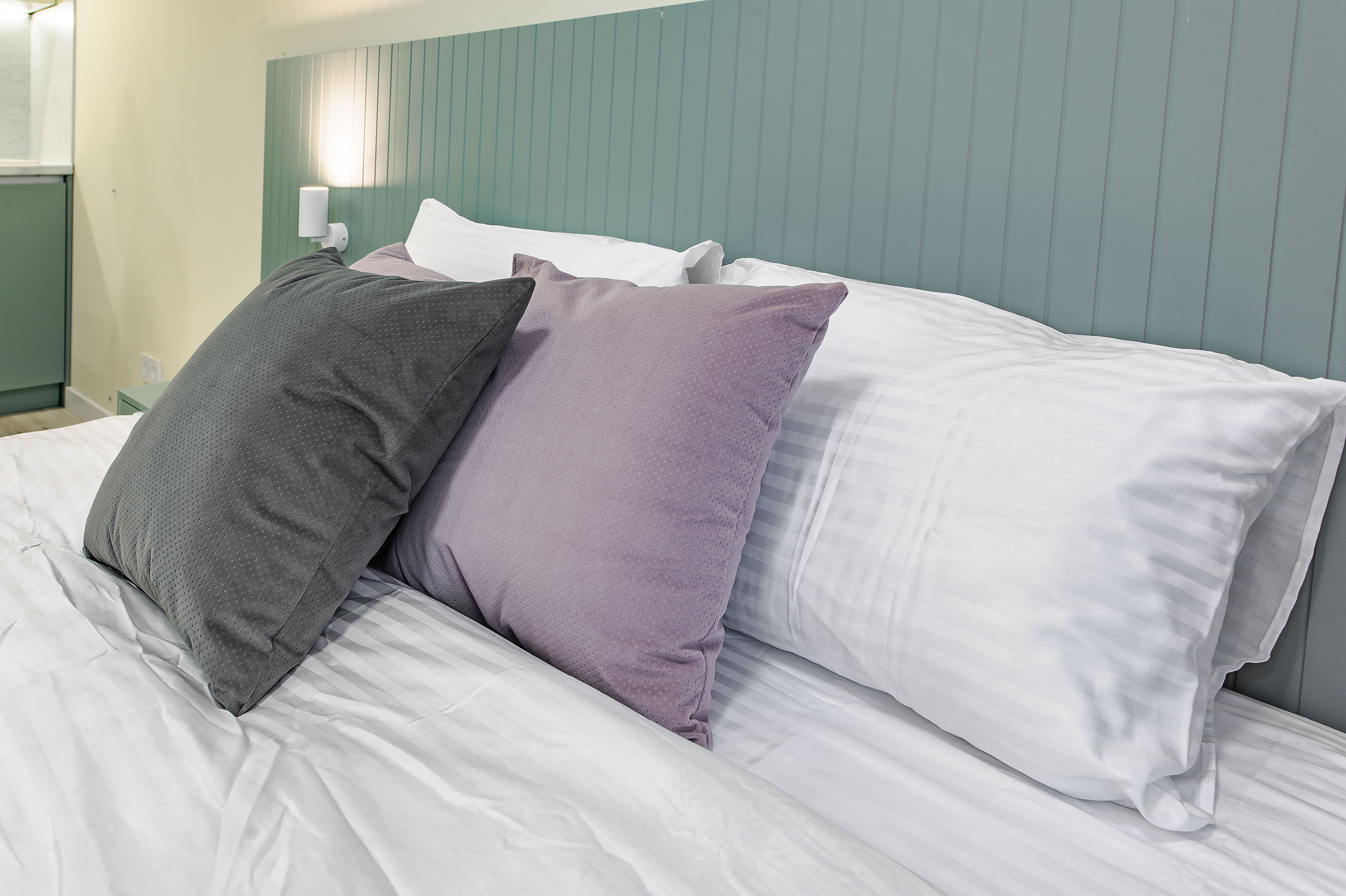 В номере: вешалка, зеркало, кровать двуспальная, кухонная мебель, прикроватные столики, стол обеденный, стулья, шкаф, микроволновая печь, набор посуды, плита электрическая, сейф, стиральная машина, телевизор, утюг, холодильник, чайный набор посуды, электрочайник