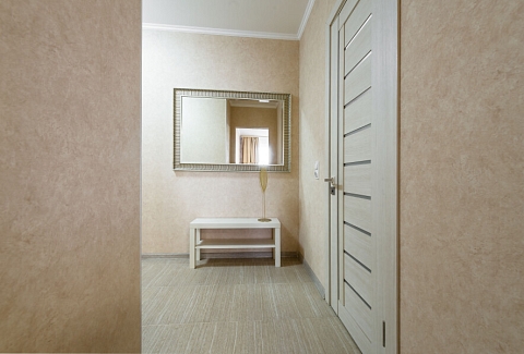 В номере: диван, зеркало, кровать двуспальная, стол, стулья, шкаф, гладильная доска, духовой шкаф, микроволновая печь, набор посуды, плита электрическая, стиральная машина, сушилка для белья, телевизор ЖК, утюг, холодильник, чайный набор посуды, электрочайник