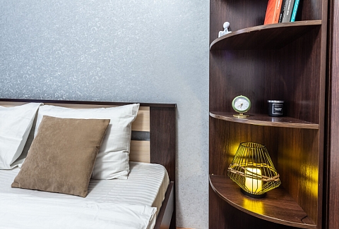 В номере: диван, зеркало, кресло-кровать, кровать двуспальная, стол, стулья, шкаф, гладильная доска, духовой шкаф, микроволновая печь, набор посуды, плита газовая, телевизор ЖК, утюг, холодильник, электрочайник